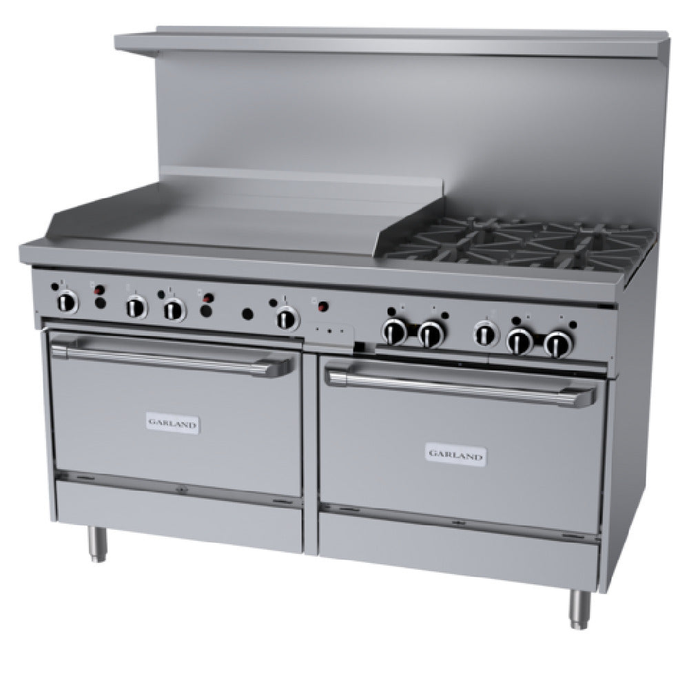 The Garland GF60-4G36RR_NAT GF Starfire Pro Series Restaurant Range is a versatile and robust gas-powered cooking solution designed for high-demand professional kitchens. This 60-inch range features four powerful open burners, each delivering 26,000 BTU, equipped with durable cast iron top and ring grates for enhanced performance and longevity. The unit includes a flame failure safety feature, ensuring reliable operation. A key component is the smooth steel griddle, measuring 36 inches by 23 inches with a thickness of 5/8 inches, which is engineered with a snap action and a modulating thermostat, offering precise temperature control ranging from 175°F to 425°F. The range incorporates two standard ovens, each equipped with three-position rack guides and an oven rack, accommodating various cooking needs. Constructed with a sleek stainless steel front, sides, plate rail, and a 10-inch low profile back guard, it ensures both durability and easy maintenance. Supported by 6-inch stainless steel legs with adjustable feet, it maintains stability. With a total output of 234,000 BTU, this range is certified by CSA Flame, CSA Star, cCSAus, CE, and NSF, making it a dependable choice for restaurants seeking powerful, efficient, and compliant kitchen equipment.