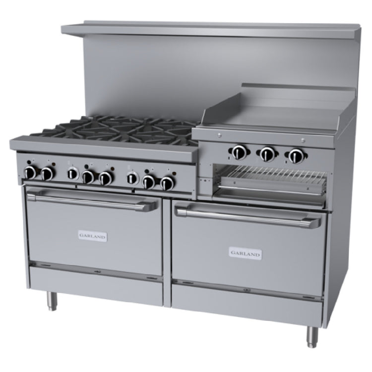 The Garland GF60-6R24RR_LP GF Starfire Pro Series Restaurant Range is a high-performance gas appliance designed for the rigorous demands of professional kitchens. With a substantial width of 60 inches, this range features six robust open burners, each delivering 26,000 BTU, complemented by durable cast iron top and ring grates. A standout feature is the 24-inch raised griddle/broiler, positioned on the right, providing versatile cooking capabilities with its manual hi/lo valve control. The dual standard ovens, equipped with three-position rack guides and oven racks, enhance its baking capacity, making it suitable for a variety of culinary tasks. Constructed with a stainless steel front, sides, plate rail, and 10-inch low-profile back guard, this range boasts both durability and style. Supported by 6-inch stainless steel legs with adjustable feet, it ensures stability on any kitchen floor. The Garland GF60-6R24RR_LP operates with a total output of 265,000 BTU, meeting the stringent standards of CSA Flame, CSA Star, cCSAus, CE, and NSF certifications. This restaurant range is an optimal choice for foodservice establishments seeking reliable, efficient, and versatile cooking solutions, ensuring culinary excellence across various market segments.