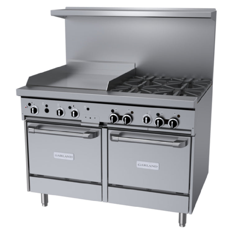 The Garland GFE48-4G24LL_LP GFE Starfire Pro Series Restaurant Range is a high-performance kitchen equipment designed for commercial culinary environments. This 48-inch gas range features four powerful open burners, each producing 26,000 BTU, supported by durable cast iron top and ring grates. Its electric pilot ignition ensures reliable and safe operation across various cooking conditions. Additionally, the range includes a 24-inch griddle with a 5/8-inch thick smooth steel plate, complemented by a snap-action and modulating thermostat capable of maintaining temperatures between 175°F and 425°F. The unit is innovatively configured with two space-saver ovens, each equipped with three-position rack guides and one rack per oven, providing flexibility and maximizing cooking capacity in limited spaces. Constructed with a stainless steel front, sides, plate rail, and a 10-inch low-profile back guard, along with 6-inch stainless steel legs featuring adjustable feet, the range offers robust durability and stability. With a total output of 204,000 BTU, this restaurant range is certified by CSA Flame, CSA Star, cCSAus, CE, and NSF, attesting to its safety and performance standards. The Garland GFE48-4G24LL_LP is an essential asset for professional kitchens seeking efficiency and reliability in their cooking operations.
