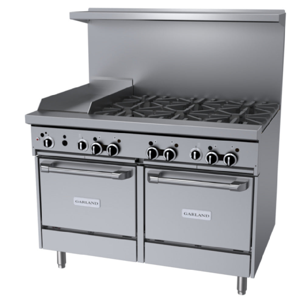 The Garland GFE48-6G12LL_NAT GFE Starfire Pro Series Restaurant Range is a high-performance gas range engineered for the demands of commercial kitchens. This 48-inch range features six robust 26,000 BTU open burners, offering powerful heat output for efficient cooking. The cast iron top and ring grates provide durability and consistent heat distribution. The range includes an electric pilot ignition system, enhancing safety and ease of use. It also boasts a 12-inch griddle with a 5/8-inch thick smooth steel plate, equipped with a snap action and modulating thermostat that allows precise temperature control from 175°F to 425°F. The unit integrates two space saver ovens with 3-position rack guides and includes one rack per oven to maximize cooking flexibility. Built with a stainless steel front, sides, plate rail, and a 10-inch low profile back guard, the range is designed for durability and easy cleaning. It stands on 6-inch stainless steel legs with adjustable feet for stability. With a total output of 238,000 BTU, this range is certified by CSA Flame, CSA Star, cCSAus, CE, and NSF, ensuring compliance with safety and quality standards. It is an invaluable asset for restaurants seeking performance and reliability.