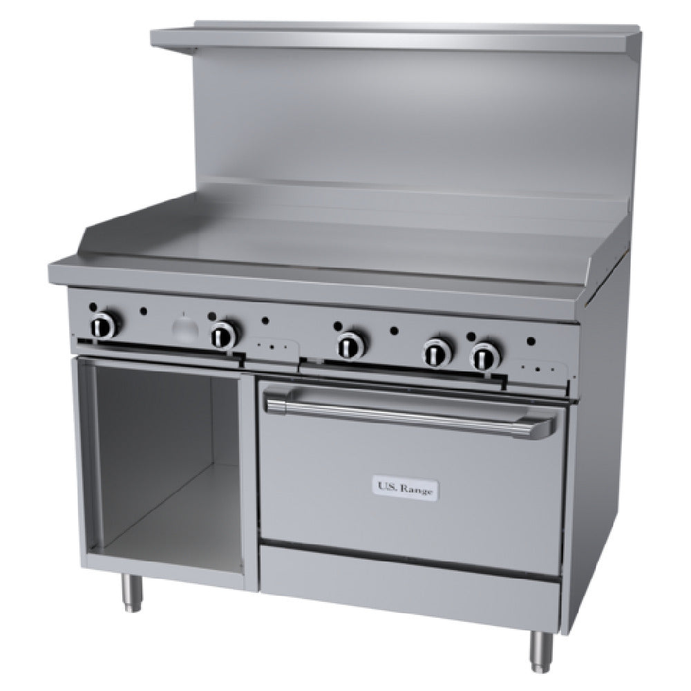 The Garland U48-G48RS_NAT U Series Restaurant Range - a versatile and robust solution for commercial kitchens - stands out with its 48-inch gas range configuration. It includes a single griddle featuring a 5/8-inch thick smooth steel plate for uniform heat distribution and consistent cooking results. The range is equipped with a standard oven, offering three position rack guides and an accompanying oven rack to accommodate various cooking needs. Additionally, it includes a storage base for convenient access to kitchen essentials. The unit is constructed with a stainless steel front, sides, and plate rail, ensuring durability and ease of maintenance. The design is complemented by a 2-piece back guard and shelf, contributing to its functionality and aesthetic appeal. Supported by 6-inch stainless steel legs with adjustable feet, the range is stable and adaptable to different kitchen environments. With a powerful output of 110,000 BTUs, the Garland U48-G48RS_NAT is certified by CSA Flame, CSA Star, cCSAus, and NSF, attesting to its safety and quality standards in the US Range category. This restaurant range is engineered to meet the demands of high-volume food service establishments, providing reliability and efficiency for culinary professionals.