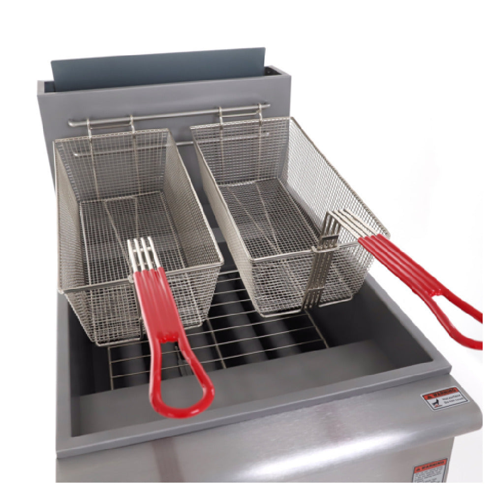 General, GFF5-70LP, General Fryer, LP, floor model, 21"W x 34"D x 46.7"H, 70 lb. capacity, (5) burners, 150kBTU, milivolt control, 200°F-400°F temperature range, (2) nickel plated baskets with PVC coated handles, basket hanger, oil cooling zone seated in the bottom of the tank, stainless steel front, ledge and header, (4) adjustable legs, cETLus, ETL-Sanitation