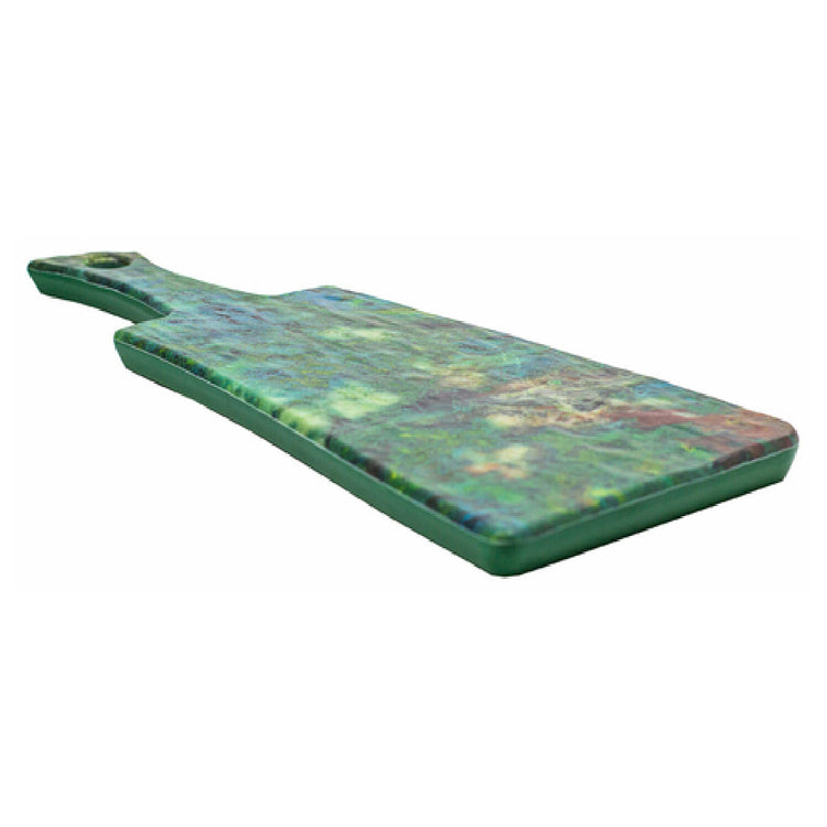The GET Enterprises 15019051037 Cheforward Lapis Board is a versatile and durable kitchen essential measuring 15-1/2 inches in length, 6 inches in width, and 1/2 inch in height. Designed in a sleek rectangular shape, this board comes equipped with a convenient handle for easy maneuverability in busy kitchen environments. Its melamine construction ensures a sturdy and long-lasting product, suitable for rigorous use. The board is dishwasher safe, adding to its practicality by allowing for effortless cleaning and maintenance, which is crucial in maintaining hygiene standards. Furthermore, it is BPA-free, making it a safe choice for food preparation and serving. The board's distinctive "parrot wing" style adds an aesthetic appeal, making it an attractive option for both professional culinary settings and home kitchens. This product is packed in a case of six, making it a cost-effective choice for bulk purchasing in commercial settings such as restaurants, catering services, or hospitality establishments. The GET Enterprises Cheforward Lapis Board stands out as a practical, safe, and stylish solution tailored to meet the diverse needs of the food service industry, balancing functionality with visual appeal.
