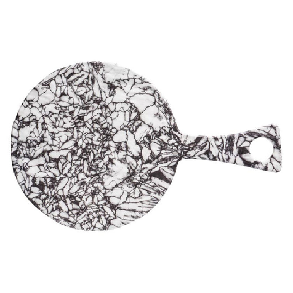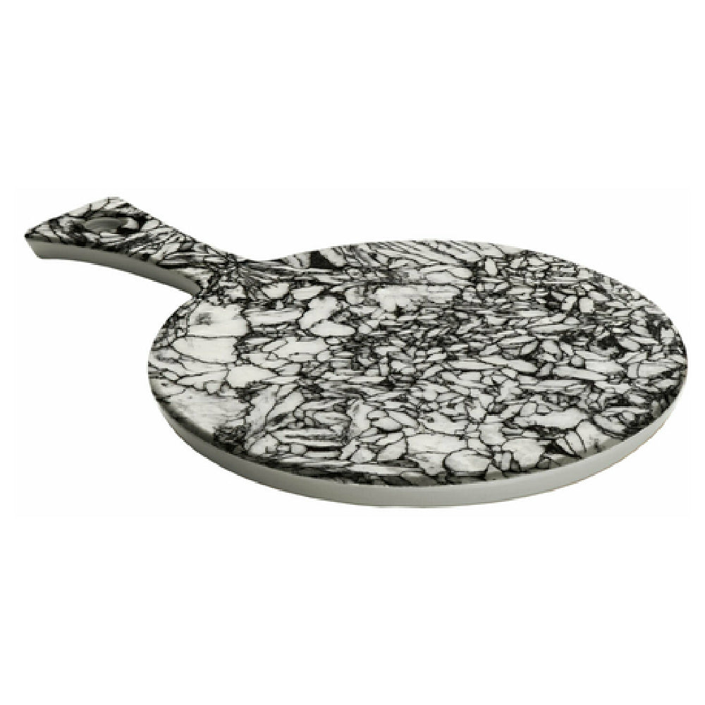 The GET Enterprises 15019052034 Cheforward Lapis Board is a versatile serving solution, measuring 15-1/4 inches in length, 9-3/5 inches in width, and 1/2 inch in height. This round board is designed with an integrated handle for easy maneuverability, making it an ideal choice for both food presentation and practical utility. Constructed from durable melamine, this board offers the aesthetic appeal of pinolith agate, presenting an elegant yet robust option for professional culinary settings. The board is BPA-free, ensuring safety for food contact, and is dishwasher safe, enhancing its practicality in fast-paced environments such as restaurants and catering services. Available in a pack of six per case, this Cheforward Lapis Board is suited for large-scale operations requiring reliable and consistent tableware. Its unique design and material make it perfect for showcasing a variety of dishes, from artisanal cheeses to gourmet entrées, catering to different market segments within the foodservice industry. This product's combination of style, safety, and ease of maintenance underscores its value proposition as a functional and attractive addition to any dining presentation toolkit.