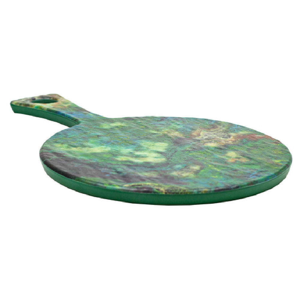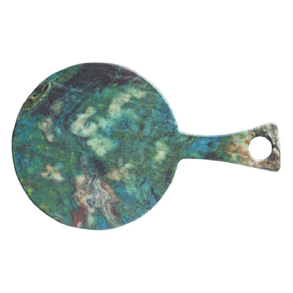 The GET Enterprises 15019052037 Cheforward Lapis Board is a meticulously crafted serving solution, measuring 15-1/4 inches in length, 9-3/5 inches in width, and 1/2 inch in height. Its round design includes a convenient handle, enhancing its functionality and ease of use. Made from durable melamine, this board is both BPA-free and dishwasher safe, ensuring safety and ease of maintenance. The Cheforward Lapis Board’s unique ‘parrot wing’ hue adds a touch of vibrant elegance, making it suitable for a range of settings from upscale dining environments to casual eateries. This product is packed six per case, allowing for efficient stocking and storage. The board’s robust construction and practical design make it an appealing choice for catering businesses and professional kitchens seeking reliable and aesthetically pleasing serveware. Its combination of durability, safety features, and eye-catching design caters to diverse market segments within the food service industry, providing a versatile platform for food presentation.