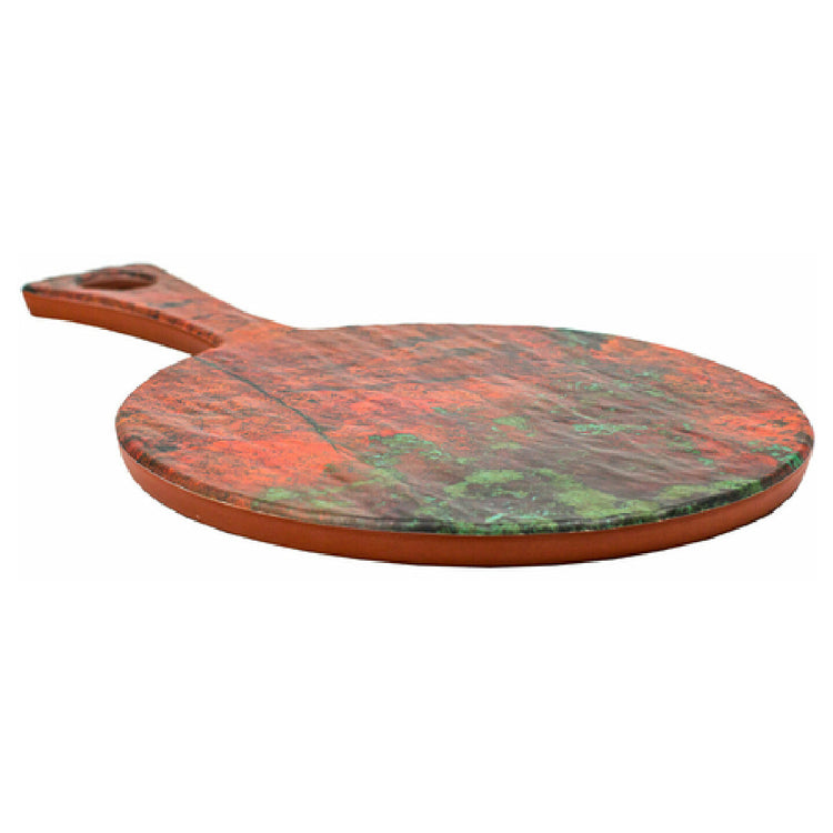 The GET Enterprises 15019052038 Cheforward Lapis Board is a versatile and sturdy accessory designed for culinary professionals and food enthusiasts alike. With dimensions of 15-1/4 inches in length, 9-3/5 inches in width, and 1/2 inch in height, this round board is crafted from durable melamine, ensuring its long-lasting use in high-demand environments. The board features a practical handle, enhancing its ease of transport and usability during food preparation or presentation. Its senora sunrise finish adds a touch of elegance to its appearance, making it suitable for both back-of-house operations and front-of-house display settings. Being BPA-free, this board prioritizes safety and health standards, catering to those who are conscious of material safety. Additionally, the board is dishwasher safe, supporting efficient cleaning processes and saving valuable time in busy kitchen settings. Packaged six per case, the Cheforward Lapis Board is ideal for restaurants, catering services, and hospitality sectors that require reliable and stylish serving solutions. This board seamlessly combines functionality with aesthetic appeal, making it a valuable addition to any food service environment.