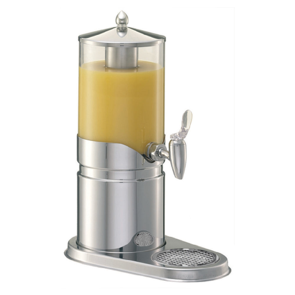 The GET Enterprises 3170010 Frilich® Elegance Juice Dispenser Set 2.6 Qt. (0.7 Gallon / 2.5 Liter) is a meticulously designed beverage server that enhances any hospitality setting. Its generous capacity of 2.6 quarts (0.7 gallons / 2.5 liters) makes it suitable for a variety of professional environments, including hotel breakfast bars and catering events. The dispenser's dimensions are 13-1/5 inches in length, 8-1/10 inches in width, and 17-1/10 inches in height, offering a compact yet spacious solution for juice presentation. This set includes a SAN plastic container known for durability and clarity, a crushed ice tube to maintain the chill of juices, and a drip tray for cleanliness and ease of use. A cooling pack is strategically included in the base to ensure beverages remain at an optimal temperature without compromising aesthetic appeal. The stainless steel base provides a sturdy and elegant support structure, ensuring long-lasting performance and a sleek appearance. Designed to be packed by 1 set, this dispenser is an efficient choice for service professionals looking to combine functionality with style. Each component is designed to cater to the practical needs of high-volume environments while maintaining a refined presentation.
