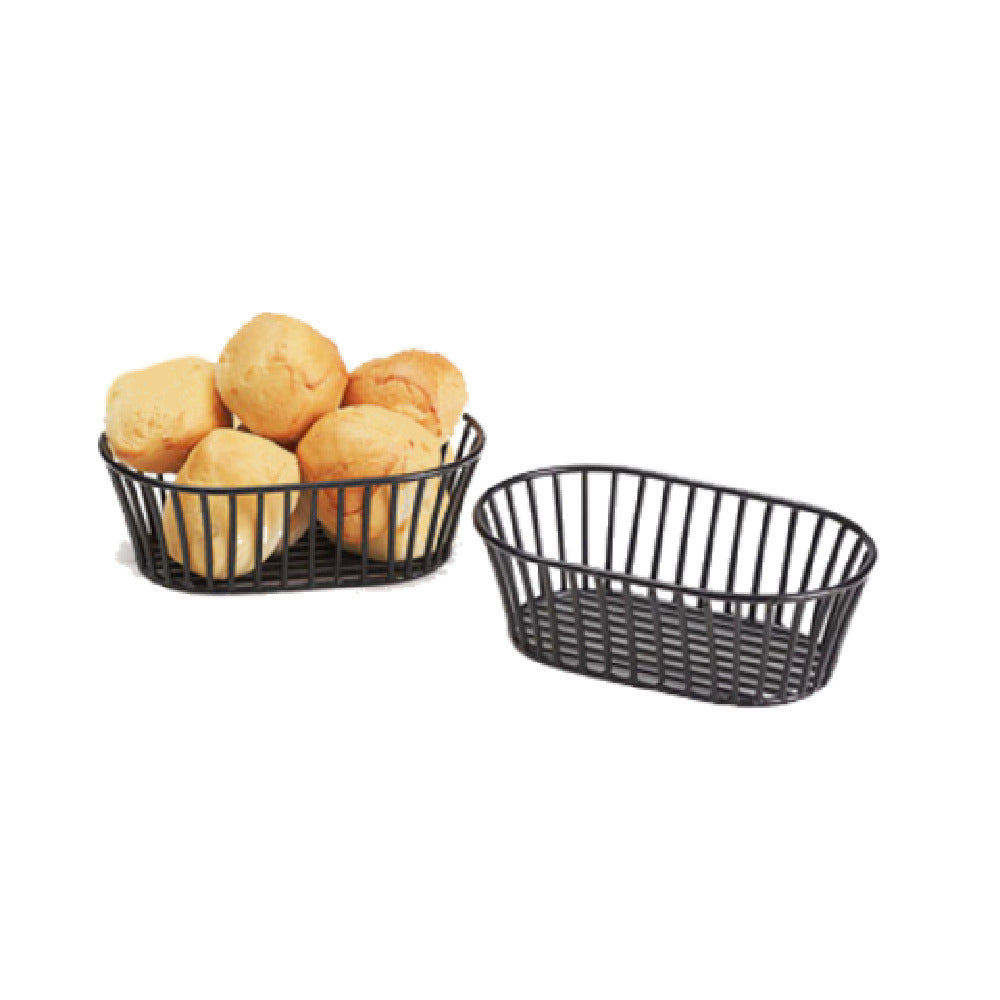 The GET Enterprises 4-31892 Clipper Mill Tuscan Basket 8-1/2" X 5-1/2" X 3" Short is a versatile and elegantly designed serving solution, ideal for the food service industry. With its precise dimensions of 8-1/2 inches in length, 5-1/2 inches in width, and 3 inches in height, this basket provides ample space for a variety of culinary presentations while maintaining a compact footprint for table settings or buffet displays. Crafted from iron and finished with a black powder coating, this oval basket not only exudes a rustic Tuscan charm but also offers durability and resistance to wear, making it suitable for frequent use in bustling restaurant environments or catering events. The product is packed with 12 baskets per case, allowing for bulk purchasing that is convenient for businesses of different scales, from small cafes to large dining establishments. The Clipper Mill Tuscan Basket by GET Enterprises stands out in the market for its blend of aesthetic appeal and functional practicality, providing an excellent serving option that enhances the presentation of bread, fruits, or other appetizers, thus adding a touch of sophistication to any dining experience.