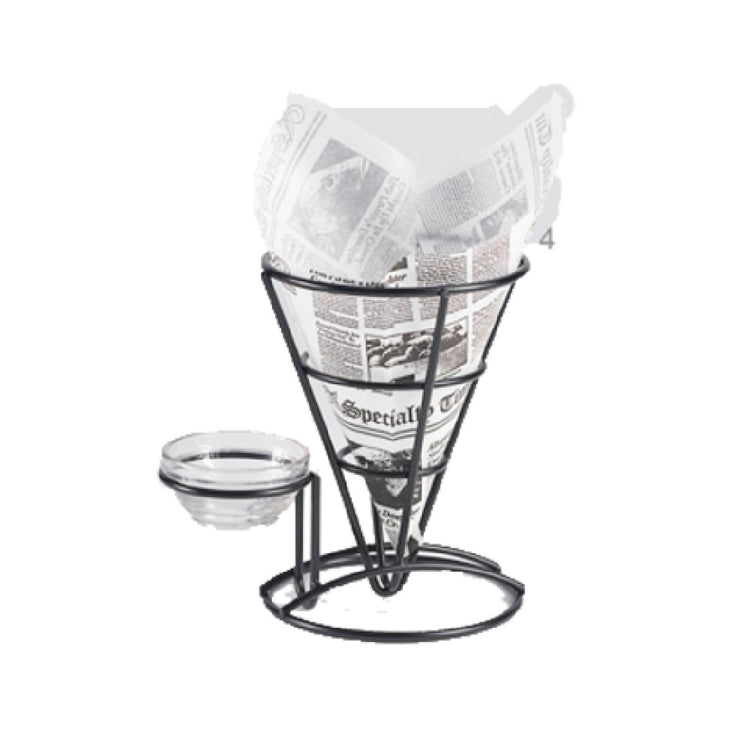 The GET Enterprises 4-361644 Clipper Mill Fry Cone Basket is a meticulously designed serving solution, measuring 5" in diameter and standing 7" tall. This innovative product is crafted with iron and powder-coated in a sleek black finish, ensuring durability and a modern aesthetic. It is uniquely engineered to accommodate various serving needs, featuring a dedicated condiment cup holder integrated seamlessly into its design. This versatile basket is compatible with multiple models, including 4-84100, 4-84111, 4-84105, ER-020, ER-025, ER-402, S-620, RM-387, F-625, RM-203, and S-617, making it an adaptable choice across different culinary presentations. The GET Enterprises fry cone basket is packed by 12 each per case, providing a convenient bulk option for large-scale operations. Its design caters to diverse market segments such as restaurants, catering services, and hospitality venues where efficient and stylish food presentation is paramount. The fry cone basket combines functionality with a sophisticated look, making it an ideal accessory for enhancing the dining experience and streamlining service. With its precise construction and thoughtful design, this item stands out as a practical and elegant solution for serving fries, appetizers, or any finger food with an added flair of sophistication.
