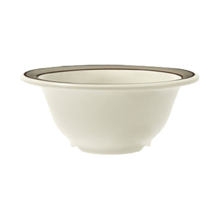 The GET Enterprises B-105-CA Diamond Cambridge™ Bowl 10 Oz. (10 Oz. Rim Full) 5-1/2" Dia. X 2-1/4"H is a premium dining solution that combines style and functionality, making it a preferred choice across various market segments, including restaurants, catering services, and hospitality venues. This elegantly designed bowl features a 10 oz. capacity, measured at the rim, ensuring ample serving space for a variety of dishes. Its dimensions are precisely 5-1/2 inches in diameter and 2-1/4 inches in height, providing a compact yet practical size suitable for individual servings. Crafted from durable melamine, this bowl is break-resistant, offering longevity and reduced replacement costs – an attractive quality for high-traffic dining environments. The bowl is both dishwasher safe and BPA-free, aligning with health and safety standards, and is NSF certified, which assures compliance with public health regulations. Its white body with a subtle gray rim adds a touch of sophistication, easily complementing diverse table settings. Sold in cases packed by 4 dozen, this bowl is an efficient solution for large-scale operations. The narrow rim design enhances the bowl’s aesthetic appeal while maintaining a focus on utility and robustness, making it a versatile addition to any dining establishment's inventory.