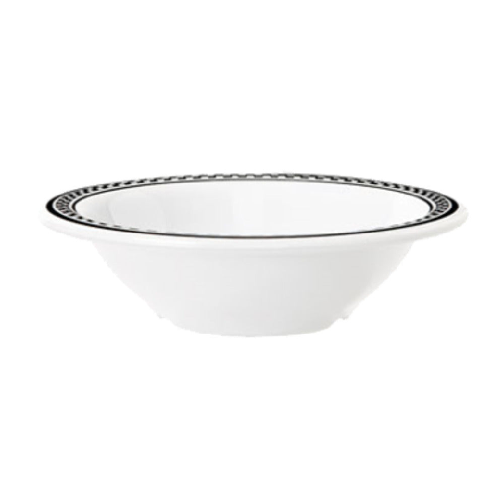 GET Enterprises B-127-X Diamond Chexers™ Bowl 12 Oz. (15-1/2 Oz. Rim Full) 7-1/4" Dia. X 1-3/4"H is a meticulously designed dining solution that caters to various market segments with diverse requirements. This bowl, crafted from durable melamine, features a capacity of 12 ounces and accommodates up to 15-1/2 ounces when filled to the rim, offering flexibility for different serving sizes. Measuring 7-1/4 inches in diameter and standing 1-3/4 inches high, its round shape with a narrow rim enhances its aesthetic appeal and functionality. The bowl's notable break-resistant quality makes it a reliable choice for environments where durability is paramount, such as in restaurants, cafeterias, and catering services. Being dishwasher safe, it supports effortless cleaning, while its BPA-free construction ensures safety in food service applications. The elegant white base, accentuated by a distinctive black checkerboard pattern on the rim, adds a classic touch suitable for various dining settings. Additionally, the bowl meets NSF standards, affirming its compliance with health and safety regulations. Packed by two dozen per case, it is an efficient choice for bulk purchasing. The GET Enterprises B-127-X Diamond Chexers™ Bowl excels in presenting a unique combination of style, durability, and practicality for the food service industry.