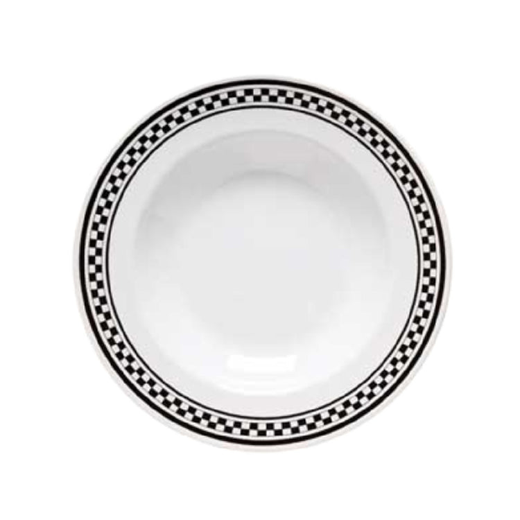 The GET Enterprises B-1611-X Diamond Chexers™ Bowl is a versatile and durable option designed for various food service settings. With a capacity of 16 ounces and a rim-full capacity of 25-4/5 ounces, this bowl is suitable for serving soups, salads, and other dishes. Measuring 11-1/4 inches in diameter and 1-3/4 inches in height, its round structure is complemented by a wide rim, featuring a distinctive black checkerboard pattern that enhances its visual appeal. Crafted from break-resistant melamine, the bowl is both BPA-free and dishwasher safe, catering to the needs of high-volume environments while ensuring safety and ease of cleaning. Its robust build makes it a practical choice for catering, hospitality, and casual dining establishments. Additionally, the bowl's NSF certification attests to its compliance with health and safety standards, making it a reliable component for professional kitchens. The GET Enterprises B-1611-X Diamond Chexers™ Bowl, available packed by the dozen, seamlessly combines functionality with a design that stands out in any setting.