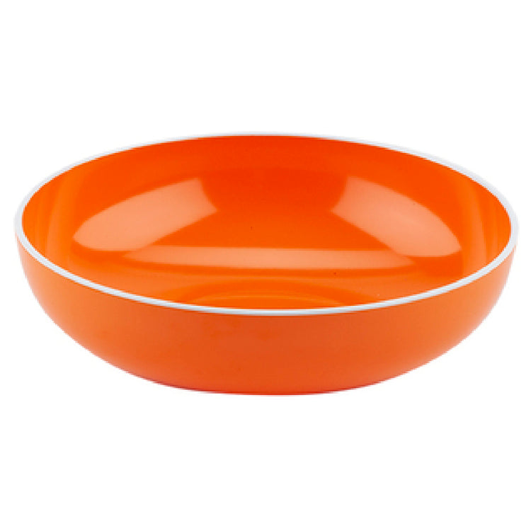 The GET Enterprises B-46-TG Settlement-Oasis Soup Bowl Large 1.7 Qt. (1.9 Qt. Rim Full) is a highly durable and functional dinnerware option designed for various dining environments. With a capacity of 1.7 quarts, expanding to 1.9 quarts when filled to the rim, this bowl measures 9 inches in diameter and 2-1/2 inches in height, providing ample space for generous servings of soup or other dishes. Crafted from break-resistant melamine, it is well-suited for high-traffic establishments such as cafeterias, restaurants, and catering services where durability is essential. The vibrant tangerine orange exterior, accented with a white trim, adds a touch of aesthetic appeal to any table setting while being BPA-free ensures a safer dining experience. This bowl is NSF certified, signifying its compliance with rigorous standards for public health and safety. It is also dishwasher safe, facilitating easy cleaning and maintenance in busy food service operations. Packaged in sets of one dozen, the GET Enterprises B-46-TG Settlement-Oasis Soup Bowl offers a practical and stylish solution for businesses looking to enhance their service efficiency and presentation.