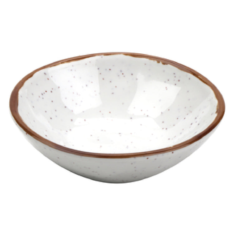 GET Enterprises B-5-RM Rustic Mill™ Monkey Dish 5 Oz. 4-1/2" Dia. X 1-1/4"H is a versatile and durable serving solution designed for various hospitality environments. This round monkey dish, featuring an irregular shape, combines functionality with a rustic aesthetic. It is crafted from melamine, ensuring it is break-resistant and dishwasher safe, making it ideal for high-traffic food service operations such as restaurants, cafes, and catering services. The dish has a cream base adorned with brown speckles and a distinctive brown rim, offering a unique visual appeal suitable for showcasing appetizers, desserts, or side dishes elegantly. With a capacity of 5 oz., and measuring 4-1/2 inches in diameter and 1-1/4 inches in height, it provides the perfect portion for individual servings. The dish is NSF certified, ensuring adherence to strict health and safety standards, and it is BPA free, guaranteeing it is safe for food contact. Packed by 6 dozen per case, this product is an excellent choice for establishments looking to enhance their table presentation while ensuring durability and practicality in everyday use.