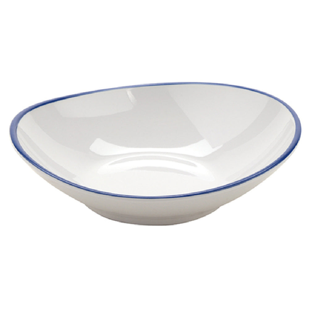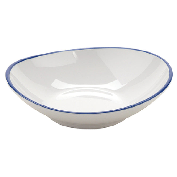 The GET Enterprises B-60-W/CB Settlement Bistro™ Enamelware Bowl 6 Oz. (8 Oz. Rim Full) 5-3/4" x 5-1/4" x 1-1/4" is an expertly designed piece of tableware that balances aesthetic appeal with practical function. It serves as an ideal option for a range of dining environments, from casual bistros to more formal settings. This shallow bowl is crafted from durable melamine, providing a lightweight yet sturdy alternative to traditional ceramic or porcelain options. Its white body is elegantly accented with a cobalt blue trim, adding a touch of classic style to any table setting. With dimensions of 5-3/4 inches by 5-1/4 inches and a height of 1-1/4 inches, it offers a 6-ounce capacity with the ability to hold up to 8 ounces when filled to the rim, making it versatile for serving both individual portions and side dishes. The bowl is dishwasher safe, ensuring easy cleaning and maintenance, and it is NSF certified and BPA free, aligning with industry standards for safety and quality. Packed by four dozen per case, this bowl is well-suited for high-volume establishments seeking reliable and aesthetically pleasing dishware solutions.