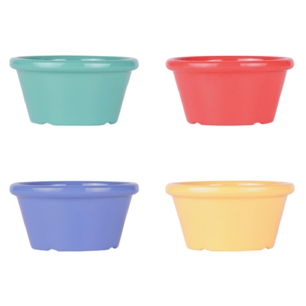 The GET Enterprises B375SM-MIX Elite Global Solutions Ramekin 6 Oz. 3-3/4" Dia. X 1-3/4"H is a versatile and durable choice for food service professionals seeking reliable serving solutions. With a capacity of 6 ounces and precise dimensions of 3-3/4" in diameter and 1-3/4" in height, this ramekin is expertly crafted to meet the demands of various culinary applications. Its round shape and robust construction make it break, chip, stain, and scratch resistant, ensuring longevity in high-traffic environments. The ramekin's melamine build not only provides a BPA-free assurance but also guarantees dishwasher safety, facilitating easy maintenance and hygiene. Available in an assortment of colors - autumn green, spring coral, violet, and yellow - it adds a vibrant touch to any table setting, enhancing the dining experience. The product's NSF certification underscores its compliance with rigorous health and safety standards, making it an ideal choice for restaurants, catering services, and hospitality sectors. Packaged conveniently with 12 pieces per case, the GET Enterprises B375SM-MIX ramekin is designed to support diverse market segments within the industry, offering a reliable, colorful, and practical solution for any professional kitchen.