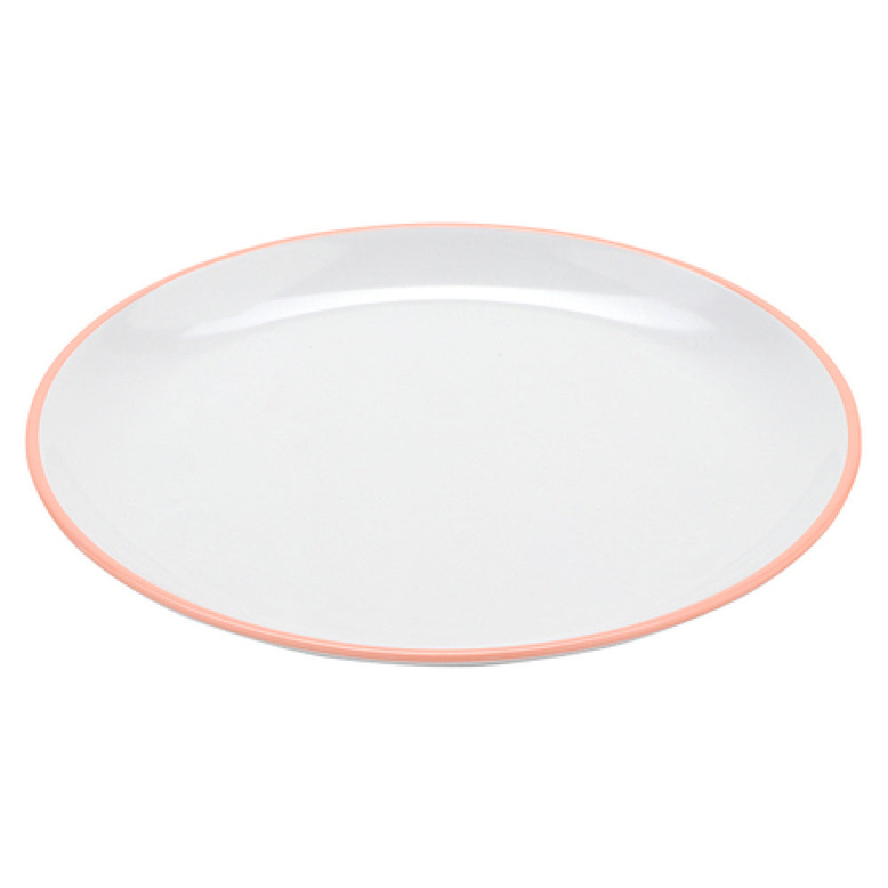 The GET Enterprises BF-1050-GF Settlement™ Oasis™ Dinner Plate stands out with its practical and aesthetic features, making it a versatile choice for various dining environments. With a diameter of 10-1/2 inches and a round shape, it is designed to perfectly accommodate main courses, enhancing presentation in both casual and formal settings. The plate's break-resistant nature ensures durability, reducing the risk of damage and replacement costs, which is particularly beneficial for busy restaurants and catering services. Made from BPA-free melamine, this plate combines safety with strength, offering peace of mind for health-conscious users. Its white surface with grapefruit pink trim adds a subtle elegance that can complement a wide range of table settings. The plate is dishwasher safe, streamlining the cleaning process and ensuring efficiency in high-volume service operations. Moreover, it is NSF certified, guaranteeing that it meets rigorous public health and safety standards. Sold in packs of twelve, it is a cost-effective solution for food service establishments seeking reliable and attractive tableware. This dinner plate is an ideal option for establishments that prioritize both style and functionality, catering to the diverse needs of the hospitality industry.