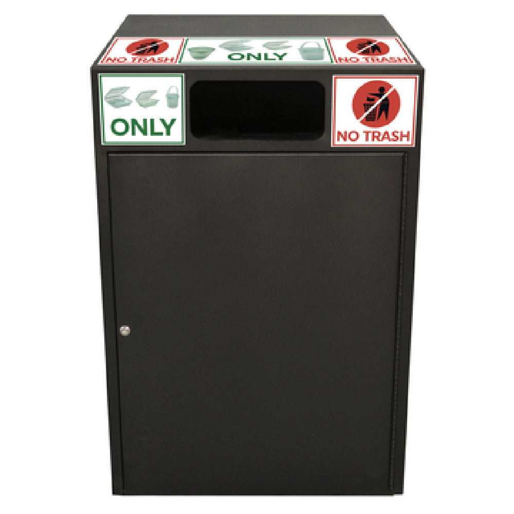 The GET Enterprises BIN-1-BK G.E.T. Eco Container Collection Bin is a robust and efficient solution designed for effective waste management in various settings. Measuring 27-L x 29-W x 40-H, this collection bin is crafted from black powder-coated steel, ensuring durability and resistance to environmental wear and tear. Its design features a convenient 11-W x 5-H opening, allowing for easy disposal of waste, while the inclusion of a locking door enhances security, making it suitable for both public and private spaces where controlled waste disposal is necessary. The BIN-1-BK is part of the Eco-Takeouts line, which emphasizes sustainability, making it an ideal choice for businesses and institutions aiming to implement eco-friendly practices. The size and functional design of this bin cater to different market segments, including hospitality, educational institutions, and corporate environments, providing a versatile and reliable waste management solution. Its durable construction and thoughtful design make it a valuable asset for those looking to maintain cleanliness and promote environmental responsibility efficiently. Whether utilized in busy cafeterias, offices, or outdoor areas, the GET Enterprises BIN-1-BK offers practical and sustainable waste management capabilities.