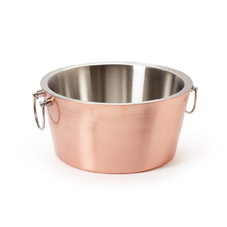 The GET Enterprises BT-1615-BCPR/SS Urban Renewal™ Beverage Tub is a standout product in the beverage service industry, designed to meet diverse market needs with a focus on durability and style. This beverage tub boasts a generous 3.5-gallon capacity, making it ideal for catering events, restaurants, and hospitality settings that require efficient and stylish beverage presentation. With a 15-inch diameter that extends to 21 inches when including the handles, this tub offers ample space while remaining easy to handle and transport. Standing at 7-1/2 inches deep, it provides sufficient volume for ice and beverages, ensuring drinks stay chilled for extended periods. The tub's round, double-wall construction enhances its insulating properties, minimizing condensation and maintaining the desired temperature. Aesthetically, its copper exterior combined with a stainless steel interior presents a modern and sophisticated look, appealing to both upscale and casual environments. This combination of materials not only ensures durability and longevity but also simplifies cleaning and maintenance, which is crucial for high-use settings. Whether used indoors or outdoors, the Urban Renewal™ Beverage Tub by GET Enterprises is a practical and visually appealing choice for businesses looking to elevate their beverage service with a product that delivers on both functionality and style.