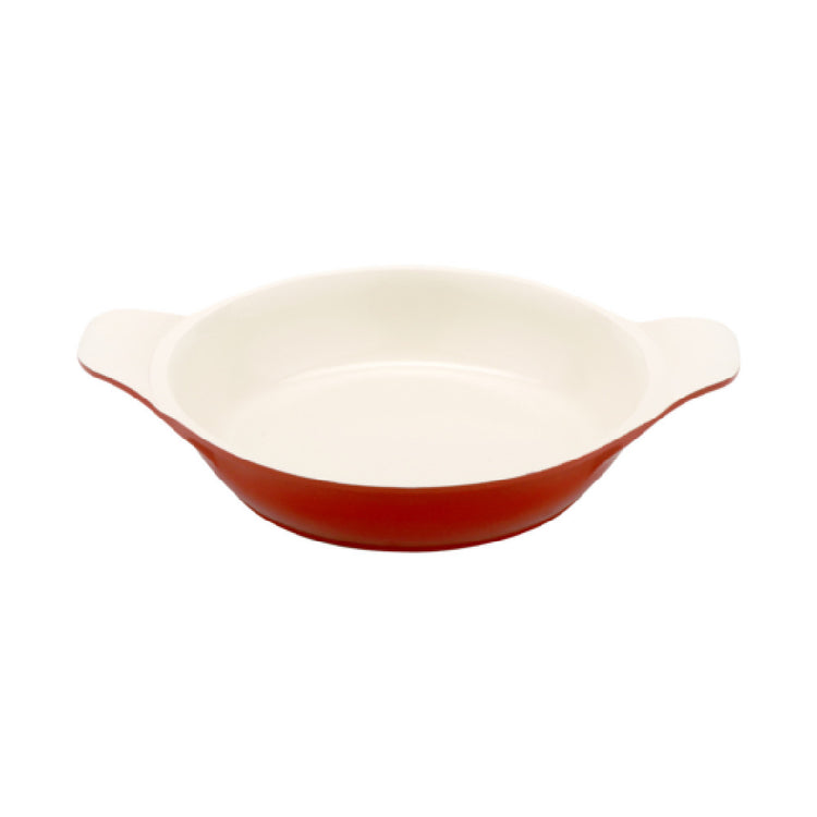 The GET Enterprises CA-001-RW/CC Heiss™ Mini Induction Pan 10 Oz. (10.75 Oz. Rim-full) 5.75" Dia. X 1-1/4"H is a versatile kitchen essential crafted for professional and home use, seamlessly integrating into diverse culinary environments. Featuring a capacity of 10 oz., expandable to 10.75 oz. when rim-full, this pan is designed with a diameter of 5.75 inches and a height of 1-1/4 inches, making it compact yet efficient for various cooking tasks. Its construction from cast aluminum, coated with ceramic enamel, offers a robust build that is heat resistant up to 500°F. This pan is compatible with multiple cooking methods, including induction, gas, electric, open flame, and oven use, providing unmatched flexibility. Beyond its cooking capabilities, the pan is chip and stain resistant, ensuring long-lasting durability and aesthetic appeal. The red exterior with a white interior and clear coat finish adds a touch of elegance to its practicality. Ergonomically designed with handles, it promises ease of use. Finally, the pan is dishwasher safe, enhancing convenience for busy kitchens. This mini induction pan, packed by six per case, is an exceptional choice for chefs seeking reliability and performance in a compact form.