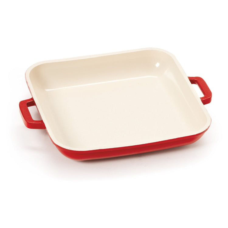 The GET Enterprises CA-004-RW/CC Heiss™ Mini Induction Grill Pan 10 Oz. (12 Oz. Rim Full) 6" X 6" X 1"H is a versatile cooking tool designed for diverse culinary environments. This grill pan features a square design with dimensions of 6 inches by 6 inches and a height of 1 inch, making it compact yet efficient for various cooking needs. Constructed from durable cast aluminum with a ceramic enamel coating, it is engineered for high performance, being heat resistant up to 500°F. Its compatibility with oven, induction, gas, electric, and open flame cooking methods underscores its adaptability across different kitchen settings. The pan comes in an attractive red with a white interior and a clear coat finish, enhancing its aesthetic appeal. It is also dishwasher safe, facilitating effortless cleaning, and is designed to resist chipping and staining, ensuring long-lasting use. Ideal for culinary professionals and home cooks alike, the GET Enterprises CA-004-RW/CC pan is packed in cases of 12, emphasizing its suitability for both individual and bulk purchasing needs. Its combination of functionality, durability, and stylish design makes it a valuable addition to any kitchen that demands versatility and performance.