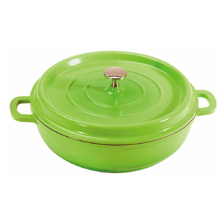 The GET Enterprises CA-005-G/BK Heiss™ Braiser Pan 3 Qt. (3-1/2 Qt. Rim Full) is a versatile culinary tool designed for various professional kitchen environments. With a diameter of 10-1/4 inches and a height of 2-7/8 inches, this round braiser pan includes a matching lid, ensuring optimal cooking conditions. Constructed from durable cast aluminum, the pan features an induction base, enhancing its compatibility with multiple heat sources such as oven, induction, gas, electric, and open flame, while being heat resistant up to 500°F. The ceramic enamel coating not only adds to its aesthetic appeal, with a striking green exterior and black interior, but also ensures the pan is chip and stain resistant, maintaining its pristine condition over time. This braiser pan's thoughtful design allows for effortless cleaning, as it is dishwasher safe, making maintenance a breeze in busy kitchen settings. Its robust construction and versatile functionality make it an ideal choice for chefs and culinary professionals looking for reliability and performance, whether they are preparing slow-cooked stews, braised meats, or sautéed vegetables. Packed as a single set, the GET Enterprises CA-005-G/BK Heiss™ Braiser Pan is an indispensable addition to any commercial kitchen's cookware collection.