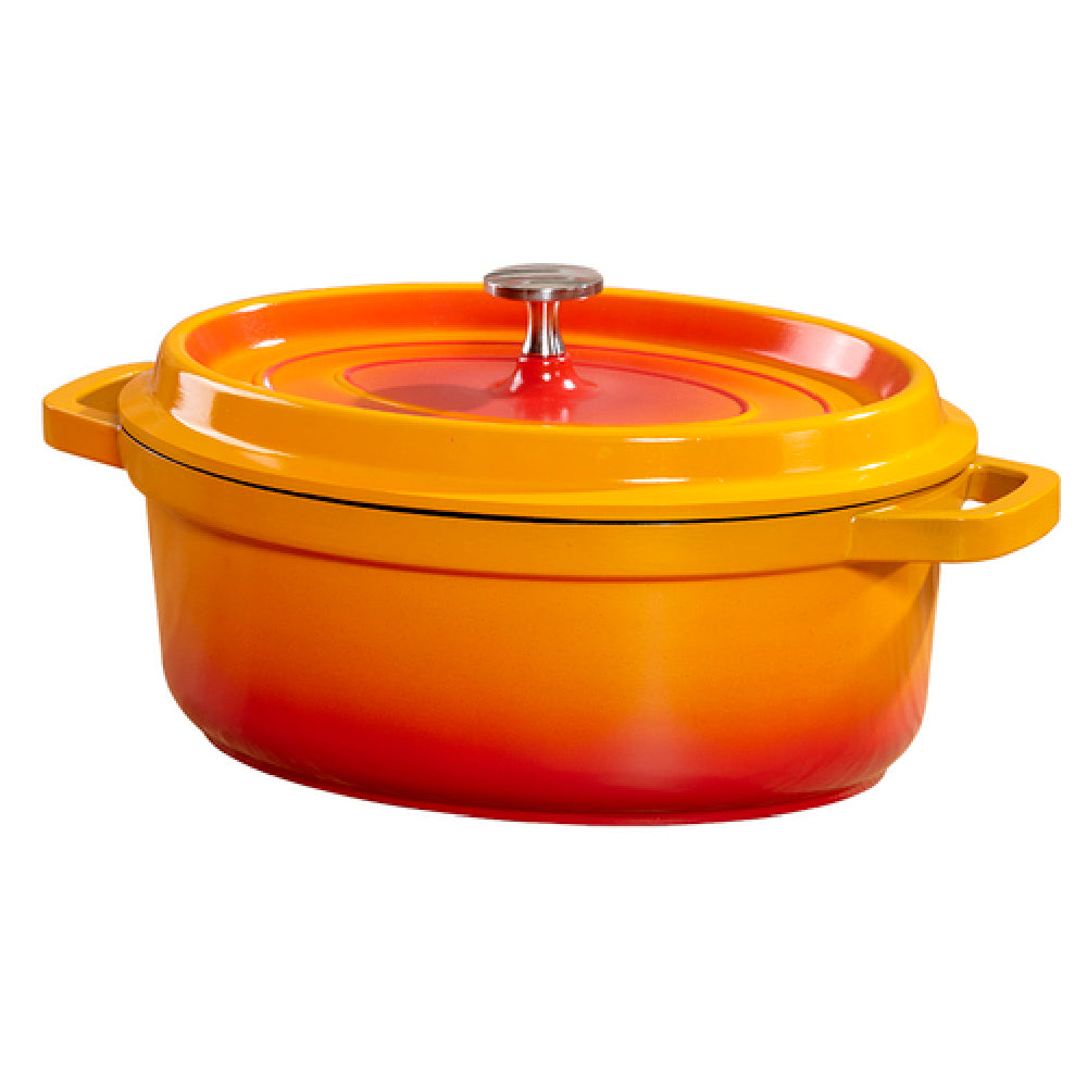The GET Enterprises CA-007-O/BK Heiss™ Induction Dutch Oven 6-1/2 Qt. (7 Qt. Rim Full) is a versatile and robust kitchen essential designed for various cooking methods. With dimensions of 12-1/8" x 9-7/8" x 4-1/4"H, this oval Dutch oven is crafted from durable cast aluminum, providing strength and efficient heat distribution. The ceramic enamel coating enhances its resilience, making it chip and stain resistant. This product is engineered to withstand temperatures up to 500°F, ensuring compatibility with oven, induction, gas, electric, and open flame cooking. The vibrant orange exterior paired with a contrasting black interior adds a touch of modern elegance to any kitchen setup. It comes with a matching lid, ensuring that flavors are sealed in during cooking. Furthermore, its dishwasher-safe design simplifies post-cooking cleanup, making it convenient for busy kitchens. This Dutch oven is ideal for both professional chefs and home cooking enthusiasts looking for reliable cookware that adapts to various heat sources and cooking environments. Its full capacity of 7 quarts at the rim provides ample space for preparing hearty meals, making it a practical choice for a range of culinary applications. Packed by a single set, this Dutch oven is a well-rounded addition to any kitchen arsenal.