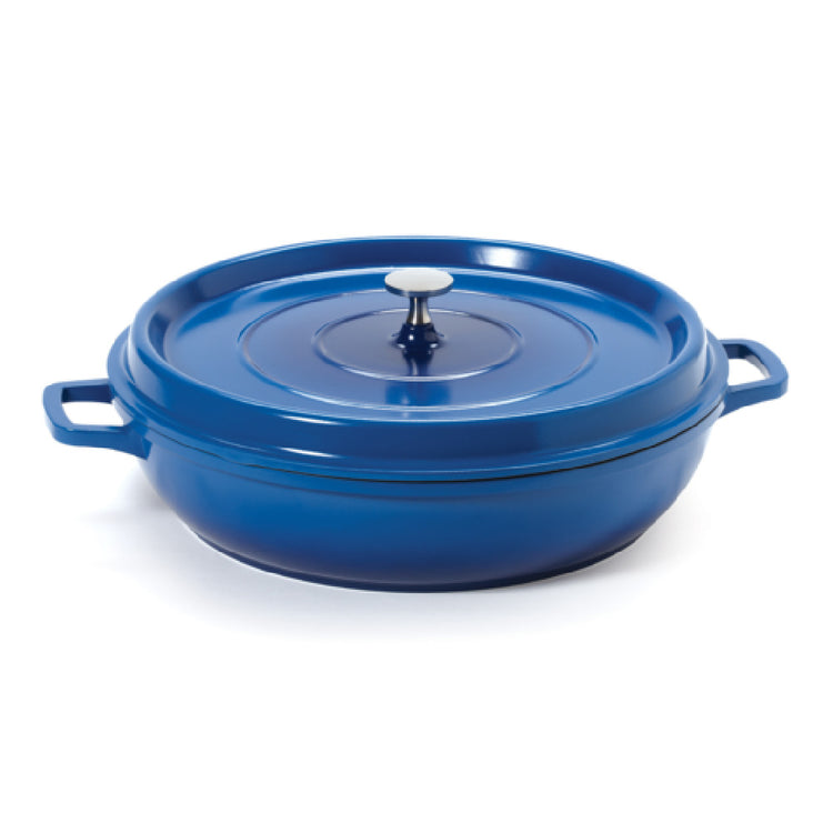 The GET Enterprises CA-008-CB/BK/CC Heiss™ Braiser Pan 4 Qt. (5 Qt. Rim Full) is a versatile cooking pan, engineered to elevate your culinary endeavors. With a diameter of 12-5/8 inches and a height of 2-7/8 inches, it offers ample space for various cooking applications. This round braiser pan comes equipped with a lid, enhancing its functionality by ensuring heat retention and optimal cooking conditions. Constructed from durable cast aluminum with an induction base, it is compatible with a range of heat sources, including oven, induction, gas, electric, and open flame, performing efficiently up to a temperature of 500°F. The pan is chip and stain resistant, featuring a ceramic enamel coating that maintains its vibrant cobalt blue exterior and sleek black interior, promising long-lasting use without compromising on aesthetics. The clear coat finish not only adds an extra layer of protection but also simplifies cleaning, as this pan is dishwasher safe. It is designed to meet the demands of both home cooks and professional chefs, offering a harmonious blend of durability, versatility, and style. The GET Enterprises Heiss™ Braiser Pan is an indispensable tool for those seeking reliable cookware that caters to diverse cooking techniques and environments.
