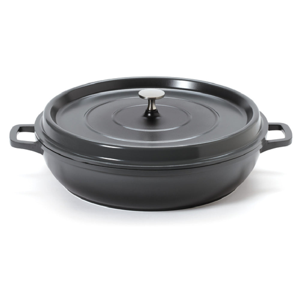 The GET Enterprises CA-008-GR/BK/CC Heiss™ Braiser Pan 4 Qt. (5 Qt. Rim Full) 12-5/8" Dia. X 2-7/8"H is an exceptional kitchen tool crafted for culinary precision and versatility. This round braiser pan, complete with a lid, is engineered to withstand temperatures up to 500°F, making it suitable for various cooking methods such as oven, induction, gas, electric, and open flame. Its 4-quart capacity, extending to 5 quarts when filled to the rim, provides ample space for a variety of recipes, catering to both home cooks and professional chefs. The pan's robust construction features a cast aluminum body with an induction base, enhancing its heat distribution and retention capabilities. Additionally, the ceramic enamel coating and clear coat finish ensure the pan is chip and stain resistant, promising longevity and a pristine appearance. The gray exterior with a black interior gives it a visually appealing contrast. This braiser pan is also dishwasher safe, simplifying the cleanup process. Its combination of durability, high heat resistance, and compatibility with multiple cooking surfaces makes it a valuable asset for diverse culinary ventures, from gourmet restaurants to modern home kitchens seeking reliable cookware solutions.