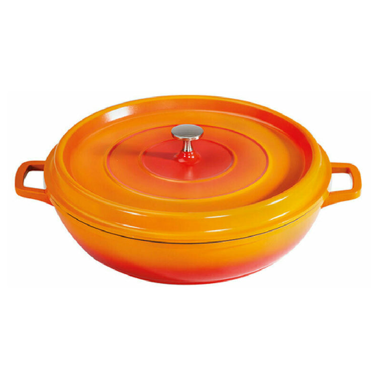 The GET Enterprises CA-008-O/BK/CC Heiss™ Braiser Pan 4 Qt. (5 Qt. Rim Full) 12-5/8" Dia. X 2-7/8"H is a high-quality cookware piece designed for versatile culinary applications. This round braiser pan, complete with a fitted lid, caters to both professional chefs and home cooking enthusiasts. Crafted from durable cast aluminum with an induction base, it ensures efficient heat distribution and retention. The ceramic enamel coating provides a chip and stain-resistant finish, enhancing the pan’s longevity and ease of cleaning. Available in a distinctive orange exterior with a black interior, it withstands heat up to 500°F, making it suitable for use on induction, gas, electric, and open flame cooktops, as well as in ovens. Dishwasher safe, it offers convenience for busy kitchens. With a diameter of 12-5/8 inches and a height of 2-7/8 inches, this pan can handle a volume of 4 quarts, expanding to 5 quarts when filled to the rim. The GET Enterprises Heiss™ Braiser Pan is a reliable choice for culinary professionals seeking a blend of functionality and durability for diverse cooking needs.