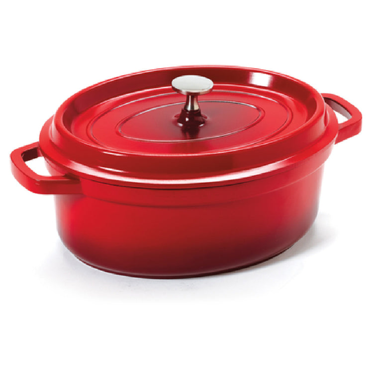The GET Enterprises CA-009-R/BK Heiss™ Induction Dutch Oven 3-1/2 Qt. (3-3/4" Qt. Rim Full) is a versatile kitchen essential, meticulously crafted for varied cooking needs. This oval-shaped Dutch oven measures 10-1/4" x 7-7/8" x 3-1/2"H, making it an optimal size for preparing a range of dishes. Constructed from durable cast aluminum, it features a robust ceramic enamel coating that enhances its chip and stain resistance. The vibrant red exterior coupled with a sleek black interior adds a touch of elegance to any kitchen setting. Engineered to withstand temperatures up to 500°F, this Dutch oven is compatible with multiple heat sources, including oven, induction, gas, electric, and open flame. Its heat-resistant properties ensure consistent performance across various cooking methods. The inclusion of a lid enhances its versatility, making it suitable for slow-cooking and braising. Dishwasher safe, it promises ease of maintenance and longevity. The GET Enterprises CA-009-R/BK Dutch oven is packed as a single set, tailored for professional chefs and culinary enthusiasts seeking reliability and efficiency in their cooking equipment. Its unique blend of functionality and design makes it an indispensable tool for diverse culinary applications.