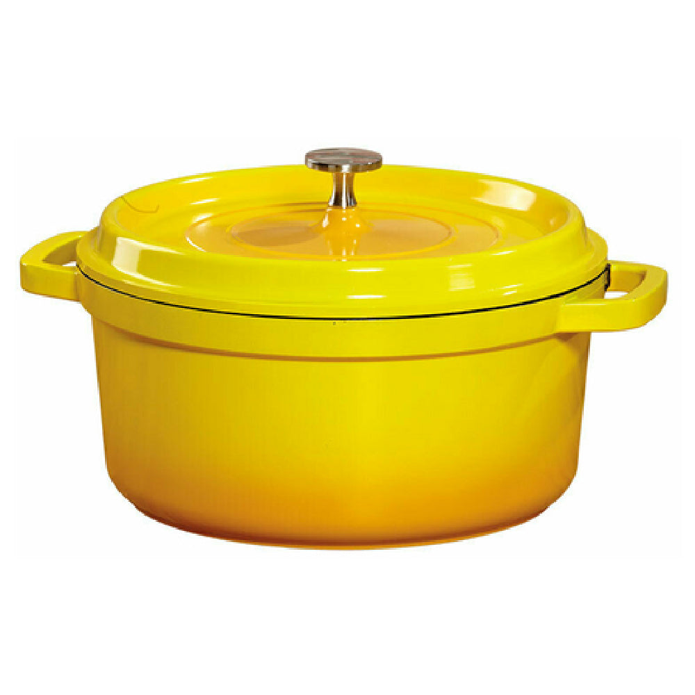 The GET Enterprises CA-012-Y/BK/CC Heiss™ Induction Dutch Oven is a versatile culinary tool, designed to meet the demands of both professional kitchens and home cooking enthusiasts. With a capacity of 4-1/2 quarts, expandable to 5 quarts when rim full, this Dutch Oven is crafted with a robust round form measuring 9-1/2 inches in diameter and 4-1/4 inches in height. The product is engineered for compatibility across various heat sources, including induction, gas, electric, and open flame, withstanding temperatures up to 500°F. Its construction features durable cast aluminum with a ceramic enamel coating, ensuring it is both chip and stain resistant, and maintaining a pristine appearance with a clear coat finish. The yellow exterior paired with a black interior creates a visually appealing contrast, while the included lid enhances cooking efficiency. This Dutch Oven is dishwasher safe, simplifying cleanup after use. The GET Enterprises CA-012-Y/BK/CC is ideal for culinary professionals seeking reliable performance and durability, as well as home cooks who appreciate high-quality cookware. Its combination of advanced materials and practical features makes it a valuable addition to any kitchen, catering to diverse cooking methods and preferences.