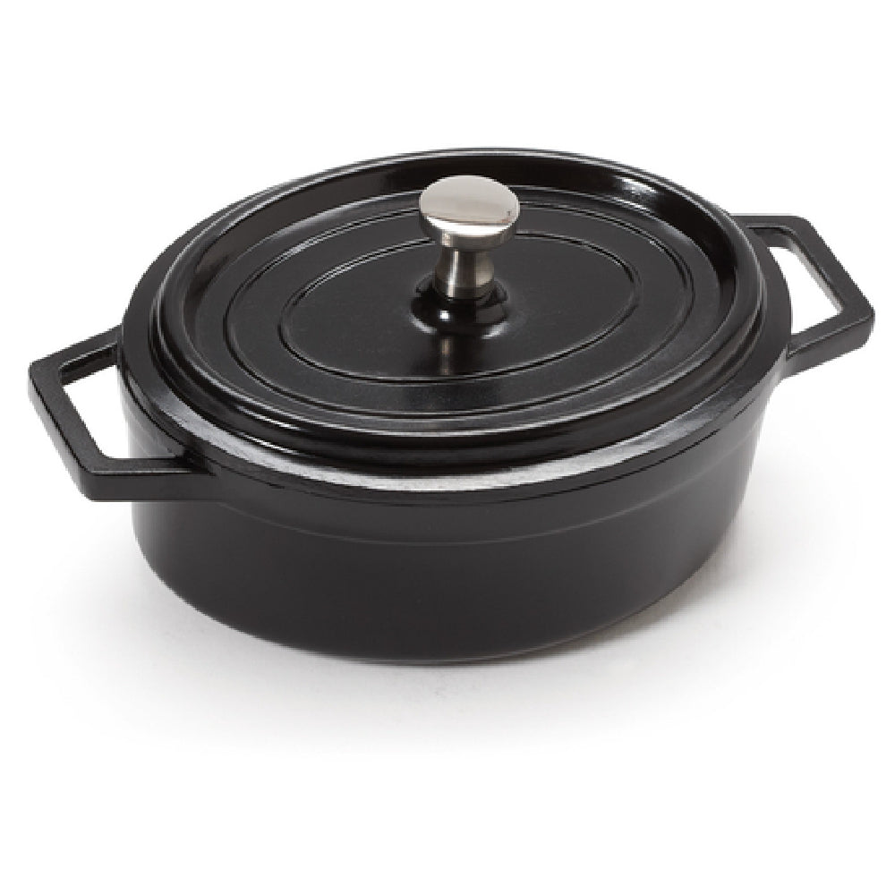 The GET Enterprises CA-103-BK/BK/CC Heiss™ Mini Induction Pot is a compact and versatile cookware item, ideal for a range of cooking applications. With a capacity of 12 oz. and a full rim capacity of 14-1/2 oz., this pot measures 5-1/2" x 4-1/4" x 2"H and features an oval shape that accommodates a variety of cooking needs. Crafted from cast aluminum with a ceramic enamel coating, this pot offers excellent heat conductivity and durability. The black exterior with a black interior and a clear coat finish ensures an attractive appearance and easy maintenance. Engineered to withstand temperatures up to 500°F, the Heiss™ Mini Induction Pot is compatible with multiple heat sources, including induction, gas, electric, and open flame. Additionally, it is oven safe and dishwasher safe, providing convenience in busy kitchens. The pot is chip and stain resistant, ensuring longevity in demanding environments. This product is packed by 6 each per case, making it suitable for both small and large-scale culinary operations. Its robust construction and versatile functionality make it a valuable asset for professional chefs and home cooks alike, enhancing the cooking experience with reliability and style.