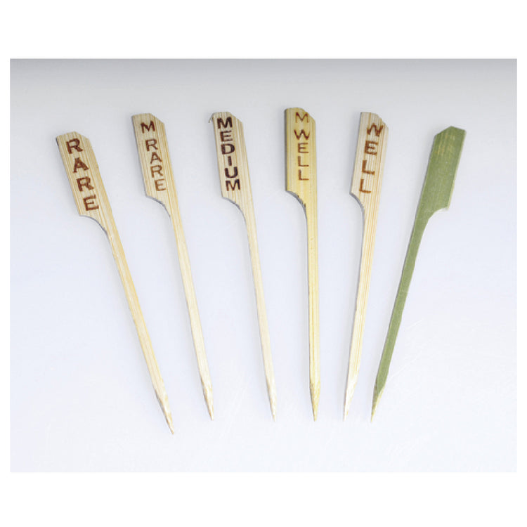 The GET Enterprises D-123 Clipper Mill Steak Marker is a specialized utensil designed for precise culinary applications, measuring 3-1/2 inches (89mm) in length and 1/10 inch (3mm) in width, with a head width of 2/5 inch (1 cm). Crafted from sustainable bamboo, this steak marker is marked with "M. WELL" to indicate doneness, making it an essential tool for professional kitchens, catering services, and steakhouses aiming for exceptional service and presentation. Each bag contains 100 pieces, offering ample supply for high-volume environments, and is sold per bag with 100 bags per master case, efficiently packed by 100 bags per case. The use of bamboo not only assures a natural aesthetic but also aligns with eco-friendly practices, appealing to environmentally conscious businesses. Its precise dimensions and clear labeling facilitate seamless integration into culinary workflows, ensuring steaks and other meats are accurately marked for cooking consistency and customer satisfaction. This product stands out in the food service industry for its combination of utility and sustainability, catering to diverse market needs from high-end dining establishments to large-scale food service operations.