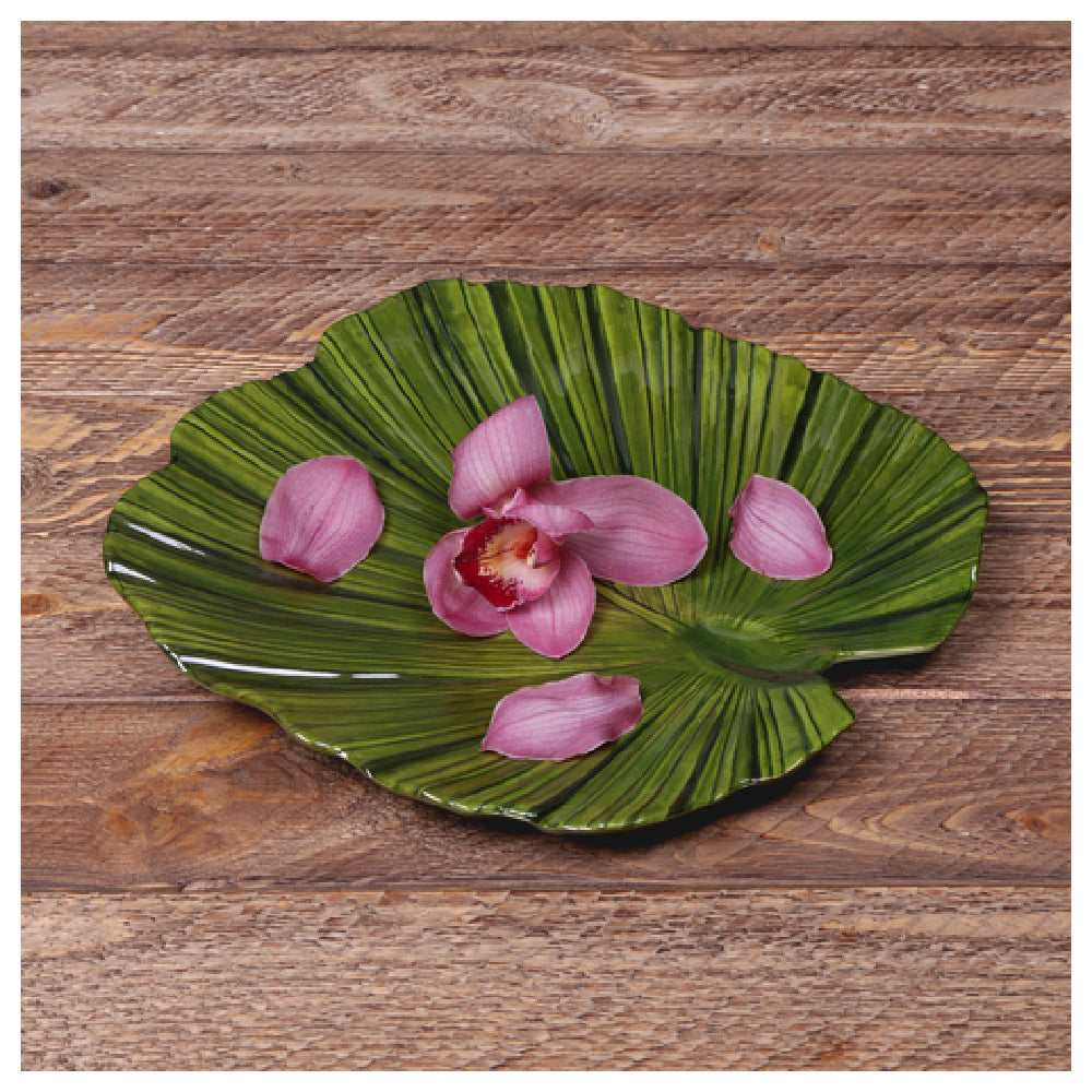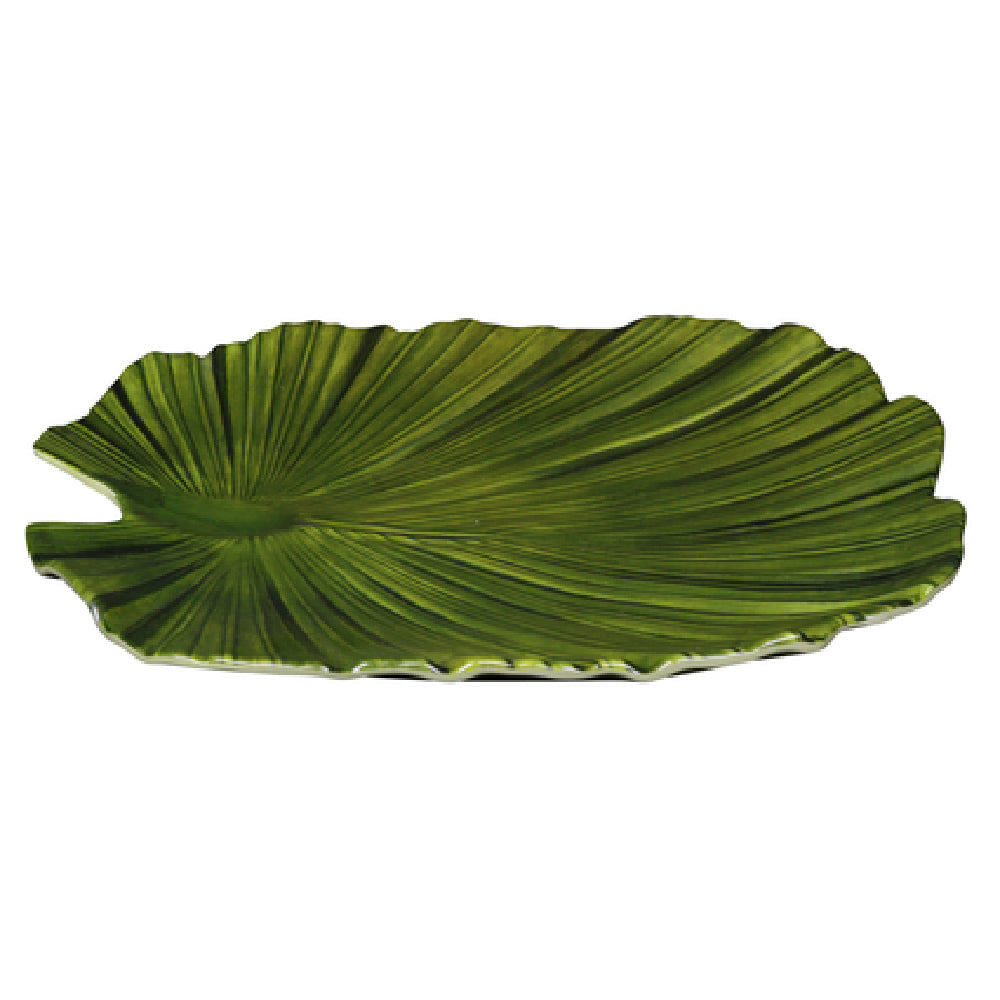 The GET Enterprises D1110PL-DG Elite Global Solutions Plate 11"L x 10"W x 1-3/8"H Large is a premium dining solution characterized by its distinct coupe and palm leaf shape design in green. This plate is designed for durability, being break, chip, stain, and scratch resistant, making it an ideal choice for high-traffic environments such as restaurants, catering services, and hospitality venues. Its melamine construction ensures it is both lightweight and robust, while also being BPA-free for safety. Additionally, the plate is dishwasher safe, simplifying the cleaning process for busy kitchens. With dimensions of 11 inches in length, 10 inches in width, and a height of 1-3/8 inches, it provides ample space for various culinary presentations. This Tropicana-themed plate is packed by six each per case, catering to bulk purchasing needs. Its unique design and durable features make it a versatile and practical choice for establishments looking to enhance their dining presentation with a touch of elegance and resilience.