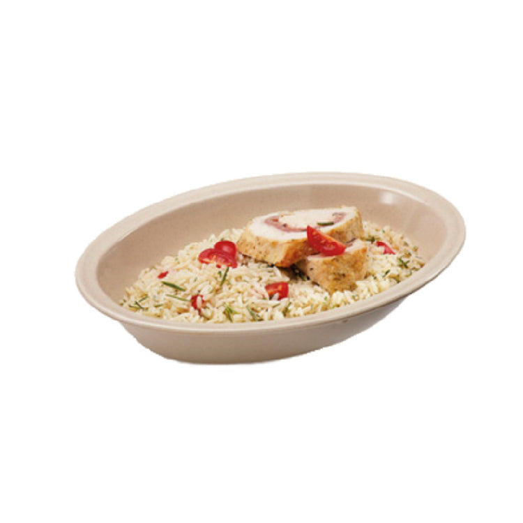 The GET Enterprises DN-332-S Supermel™ Bowl is a versatile dining solution, accommodating various culinary needs with its 32 oz. capacity and 36 oz. when filled to the rim. Measuring 10" in length, 7-1/4" in width, and 2-1/4" in height, this oval-shaped bowl provides ample space for diverse serving options. Its rimmed design not only adds to its aesthetic appeal but also aids in maintaining structural integrity. Crafted from durable melamine, the bowl is break-resistant, making it a practical choice for high-traffic environments such as restaurants, catering services, and cafeterias. The sandstone finish enhances its visual appeal, offering a sophisticated look that complements various table settings. Being dishwasher safe, it ensures ease of maintenance and cleanliness, aligning with the operational needs of busy food service establishments. The bowl is certified by the NSF, underscoring its compliance with health and safety standards. Packed by the dozen, the GET Enterprises DN-332-S Supermel™ Bowl is ideal for both commercial and institutional use, balancing durability with elegance. Its design and construction make it a reliable choice for any dining environment requiring high-quality, long-lasting serveware.