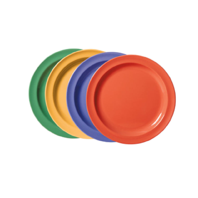 The GET Enterprises DP-910-MIX Creative Table™ Supermel™ Dinner Plate is a 10" diameter plate with a narrow rim, specifically designed for durability and versatility in various dining settings. Crafted from break-resistant melamine, this plate is ideal for high-traffic environments such as restaurants, cafeterias, and catering events, where longevity and resilience are paramount. The plate is dishwasher safe, ensuring ease of cleaning and maintenance, an essential feature for busy commercial kitchens. It comes in a mixed pack of vibrant Mardi Gras colors including tropical yellow, rio orange, peacock blue, and rainforest green, providing a lively and engaging dining experience. This color variety not only enhances table presentation but also offers flexibility for different thematic settings. The GET Enterprises DP-910-MIX plate is NSF certified, indicating its compliance with strict standards for public health protection. Packed by two dozen per case, it offers a practical and economical choice for bulk purchasing. Its design and material make it a sustainable and cost-effective option for establishments seeking reliable dinnerware that maintains aesthetic appeal while withstanding the rigors of repeated use. This plate embodies a blend of functionality and style, catering to diverse market segments within the food service industry.