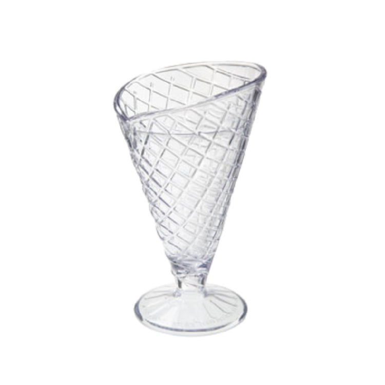The GET Enterprises ICM-26-2-CL Dessert Time™ Waffle Cone Cup is a meticulously designed clear dessert holder, perfect for various culinary settings. With a capacity of 8 ounces, this cup measures 4 inches in diameter and stands 6-1/2 inches tall, making it an ideal choice for presenting ice cream, sorbets, and other dessert creations. Crafted from break-resistant SAN material, it ensures durability and longevity, allowing for repeated usage without compromising its structural integrity. The BPA-free composition of this waffle cone cup addresses health concerns, catering to conscientious consumers and businesses. Its NSF certification underscores its compliance with rigorous safety and quality standards, making it a reliable option in the food service industry. Dishwasher safe, it provides convenience and ease of cleaning, crucial in high-volume operational environments. Packed by 2 dozen per case, this product supports bulk purchasing for businesses ranging from restaurants and cafes to catering services and ice cream parlors. The GET Enterprises ICM-26-2-CL Dessert Time™ Waffle Cone Cup seamlessly combines practicality with aesthetic appeal, enhancing the presentation of dessert offerings while ensuring operational efficiency.