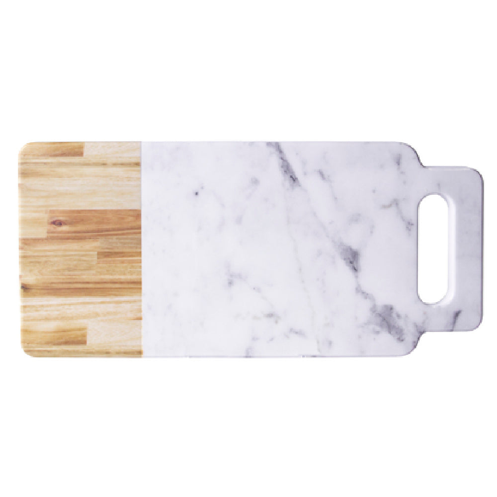 The GET Enterprises M715RCM-AWC Elite Global Solutions Melamine Serving Board is a meticulously designed culinary accessory, measuring 15 inches in length, 7 inches in width, and 7/8 inches in height. Its rectangular shape is enhanced by a convenient handle, making it a practical tool for various serving needs. Notable for its durability, this serving board is break, chip, stain, and scratch resistant, ensuring longevity even in high-traffic environments. It is dishwasher safe, providing ease of maintenance while adhering to hygiene standards. Crafted with a faux alder wood and carrara marble appearance, the board offers a sophisticated aesthetic that suits upscale presentations. The BPA-free construction underscores its commitment to user safety, making it suitable for health-conscious establishments. Sold in cases of six, the GET Enterprises M715RCM-AWC serving board is an ideal choice for restaurants, catering services, and hospitality venues seeking a blend of resilience and elegance in their serving ware. The Sierra design adds a touch of rustic charm, enhancing the presentation of culinary creations across diverse market segments within the food service industry. This product embodies a balance of style and functionality, making it a staple for those demanding both performance and aesthetic appeal in their kitchen repertoire.