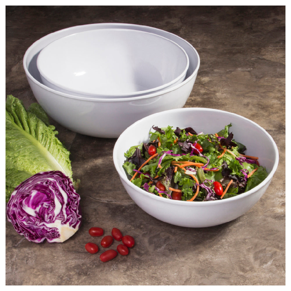 The GET Enterprises M9R3-NW Elite Global Solutions Bowl 2-1/4 Qt. (72 Oz.) 9" Dia. x 3"H is a premium choice for various food service applications, emphasizing durability and functionality. This versatile bowl boasts a substantial capacity of 2-1/4 quarts (72 ounces), making it perfect for serving large portions in restaurants, catering events, or buffets. Its 9-inch diameter and 3-inch height provide ample space while maintaining a manageable size for handling and storage. The bowl's innovative inside ring design enhances its appeal, adding a touch of sophistication to any presentation. Crafted from break, chip, stain, and scratch-resistant melamine, it ensures long-lasting performance even in high-traffic environments. The display white finish offers a classic and clean look, seamlessly fitting into various décor settings. Being dishwasher safe and BPA-free, this bowl prioritizes user convenience and safety. Furthermore, its NSF certification guarantees compliance with strict public health standards, making it a reliable choice for professional kitchens. Available in cases of six, the GET Enterprises M9R3-NW Elite Global Solutions Bowl is ideal for businesses seeking durable and elegant serving solutions without compromising on quality and safety.