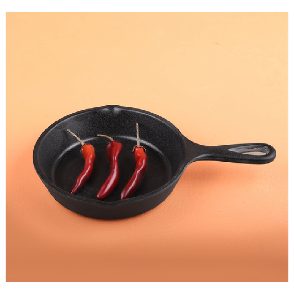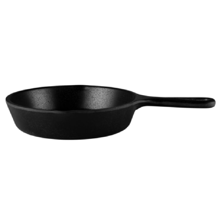 The GET Enterprises MFP5-B Elite Global Solutions Melamine Fry Pan 5" Dia. X 1-1/8"H Round is a meticulously designed culinary tool catering to diverse market segments such as restaurants, catering services, and home kitchens. This fry pan measures 5 inches in diameter and stands 1-1/8 inches high, featuring a 2-3/4 inch handle that ensures ease of use during cooking and serving. The pan's faux cast iron appearance provides a sophisticated aesthetic, while its melamine construction guarantees durability. It is resistant to breaking, chipping, staining, and scratching, making it an enduring choice for high-volume settings. The dishwasher-safe feature adds convenience for busy kitchens, and being BPA-free emphasizes safety in food preparation. Available in a classic black color, the pan is packed in cases of six, making it suitable for bulk purchases by commercial establishments. The GET Enterprises MFP5-B melds functionality with a stylish design, ensuring that it meets the practical needs of chefs while accentuating visual appeal. Its exceptional resilience and user-friendly features make this fry pan a valuable addition to any culinary environment, enhancing both the cooking experience and presentation of dishes.