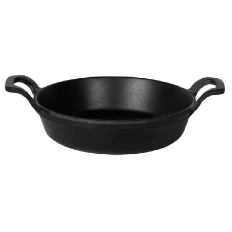 The GET Enterprises MFP6381-B Elite Global Solutions Melamine Fry Pan 6-3/8" Dia X 1-1/2"H is a versatile culinary tool engineered for durability and style, perfect for various food service sectors. This fry pan features a 6-3/8-inch diameter and stands 1-1/2 inches high, making it a practical choice for individual servings or small dishes. It is equipped with dual 1-1/4-inch handles, facilitating easy handling and serving. Constructed from high-quality melamine, this pan offers a faux cast iron appearance, combining aesthetic appeal with functionality. It is break, chip, stain, and scratch resistant, ensuring longevity and a professional look even with frequent use. The pan is BPA free and dishwasher safe, contributing to a safe and efficient kitchen environment. The sleek black finish enhances its modern design, making it a sophisticated addition to any dining setting. Whether used in restaurants, hotels, or catering services, the GET Enterprises MFP6381-B pan delivers a reliable and attractive solution for food presentation. Packed by 12 each per case, it supports bulk operations and is optimized for businesses aiming to balance style with practicality.