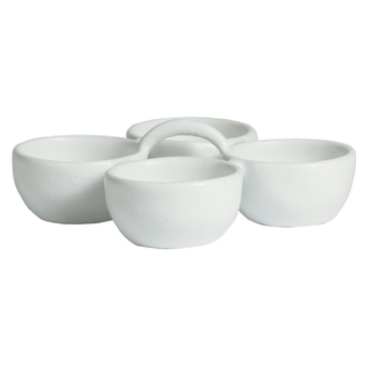 The GET Enterprises MJ601-MOD Bugambilia® Condiment Bowl 4-division 10.1 Oz. is a meticulously crafted piece designed to elevate the presentation and functionality of condiment service in various culinary settings. This bowl has a diameter of 9-1/2 inches and a depth of 2-1/2 inches, providing a substantial capacity of 10.1 ounces across its four divisions, making it an excellent choice for organizing multiple condiments simultaneously. Constructed from cast aluminum and enhanced with a durable resin coating, this condiment bowl ensures longevity and resistance to wear, while its smooth finish adds a touch of elegance to any table setting. The MJ601-MOD's robust material composition makes it ideal for high-volume environments such as restaurants, catering services, and hospitality venues, where durability and ease of cleaning are paramount. With a lead time of 3-4 weeks, each unit is packed individually, ensuring the product arrives in pristine condition. This condiment bowl stands out in the food service industry by combining functionality with a sophisticated aesthetic, making it a valuable addition to any establishment looking to enhance both their service efficiency and tabletop appeal.