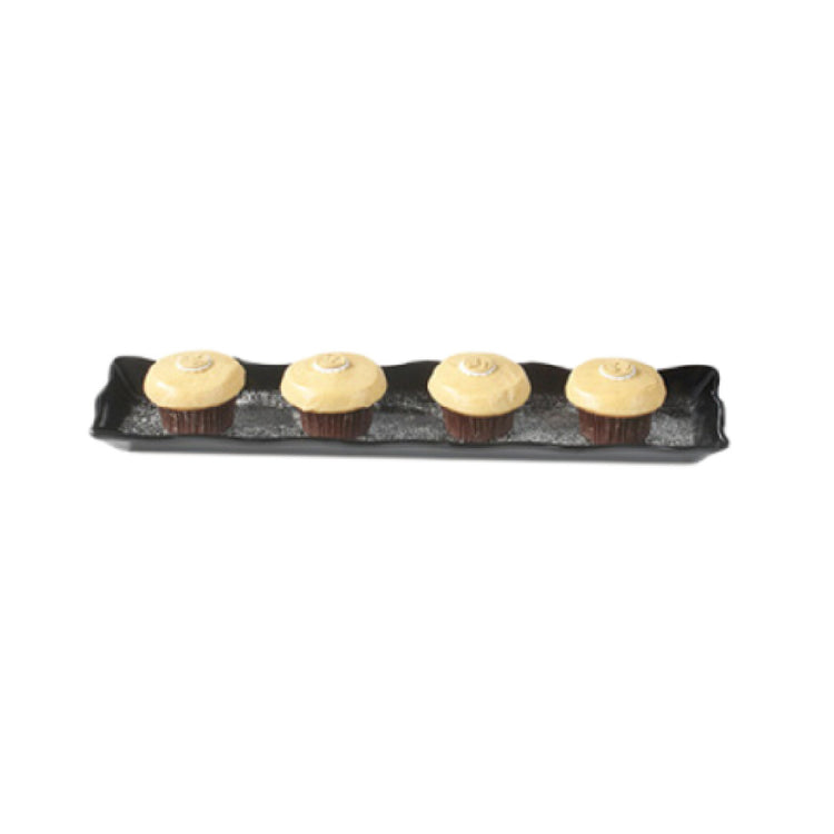 The GET Enterprises ML-113-BK Bake & Brew™ Display Tray is a rectangular, 23-inch by 5-1/4-inch tray uniquely designed for durability and style. With its distinct scallop edge, it adds an elegant touch to any presentation, making it suitable for upscale bakeries and cafes. The tray is constructed from break-resistant melamine, ensuring it withstands the rigors of frequent use while maintaining a visually appealing appearance. Its black finish adds a sleek, modern aesthetic that complements a variety of decor styles. Equipped with rubber feet, the tray offers stability and minimizes slipping, ensuring items remain securely in place. This feature is particularly beneficial in high-traffic environments like restaurants and catering events. The tray is BPA-free, reflecting a commitment to health and safety standards, and is NSF certified, guaranteeing compliance with public health regulations. Additionally, it is dishwasher safe, simplifying the cleaning process and making it a practical choice for busy food service operations. The GET Enterprises ML-113-BK Bake & Brew™ Display Tray comes packed with 12 trays per case, catering to businesses with large-scale needs, making it an ideal investment for those in hospitality and food service industries seeking reliable, high-quality display solutions.