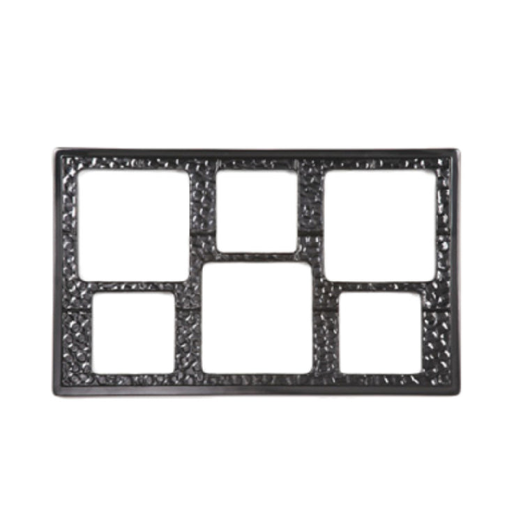 The GET Enterprises ML-162-BK Tile Full Size - Includes (6) Cut Outs (2 Sizes 3 Of Each) is a specialized product designed for precise culinary presentation. This full-size tile comes with six cut-outs, divided into two distinct sizes, with three cut-outs for each size, accommodating square crocks such as ML-148, ML-149, or ML-150. It is specifically engineered for cold applications only, ensuring optimal performance in environments requiring cold food displays or presentations. Crafted from durable melamine, the tile is not only break-resistant but also dishwasher safe, offering convenience and longevity in busy kitchen settings. The sleek black finish of the tile adds a modern and professional aesthetic to any food service operation. Furthermore, the product is NSF certified, signifying adherence to strict public health and safety standards. This makes it an ideal choice for restaurants, catering services, and buffet setups where food safety and quality presentation are paramount. The GET Enterprises ML-162-BK Tile Full Size provides a functional and stylish solution for various segments within the food industry, catering to both aesthetic and practical requirements with its robust design and versatile use.