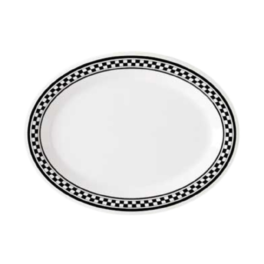 The GET Enterprises OP-120-X Diamond Chexers™ Platter is an oval-shaped serving ware measuring 12 inches in length by 9 inches in width, designed to withstand the rigors of commercial use with its break-resistant construction. Crafted from high-quality melamine, this platter is both BPA-free and dishwasher safe, offering a durable and easy-to-clean option for food service professionals. The striking design features a white surface with a distinctive black checkerboard pattern adorning the rim, creating a visually appealing presentation for any dish. This platter is NSF certified, ensuring it meets the standards for safety and quality within the food service industry. Packed by the dozen, it is an ideal solution for restaurants, caterers, and hospitality venues looking to enhance their dining service with a stylish yet functional serving piece. The GET Enterprises OP-120-X Diamond Chexers™ Platter combines aesthetic appeal with practical features, making it a versatile choice for various market segments within the food service industry.