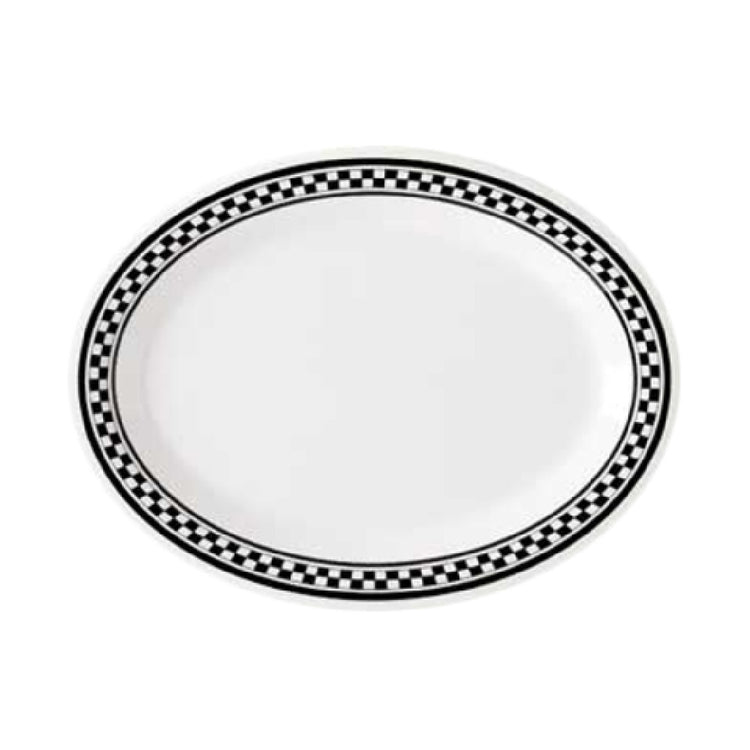 The GET Enterprises OP-135-X Diamond Chexers™ Platter 13-1/2"L x 10-1/4"W Oval is a uniquely designed serving piece crafted to meet the demands of various segments in the foodservice industry. Its dimensions, 13-1/2 inches in length and 10-1/4 inches in width, provide ample space for presenting an array of culinary creations. This oval platter is distinguished by its break-resistant construction, making it a durable choice for busy environments such as restaurants, catering services, and buffets. Made from high-quality melamine, the platter is both BPA-free and dishwasher safe, ensuring safety and ease of cleaning. The design features a striking white surface complemented by a black checkerboard pattern on the rim, adding a touch of elegance and sophistication to any table setting. Its compliance with NSF standards further underscores its commitment to public health and safety. Packed by the dozen, it offers practicality for larger operations needing consistent and reliable serving solutions. The GET Enterprises OP-135-X Diamond Chexers™ Platter is an ideal choice for those seeking a blend of durability, safety, and aesthetic appeal in their serving ware.