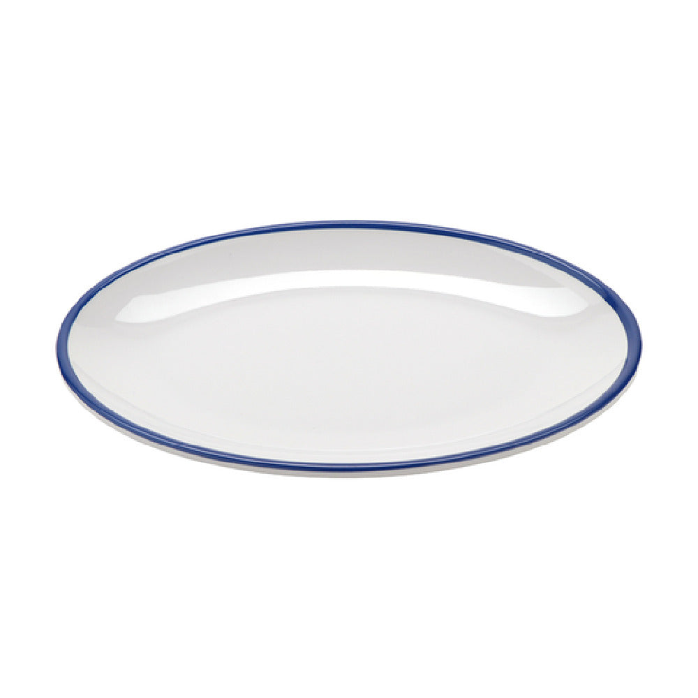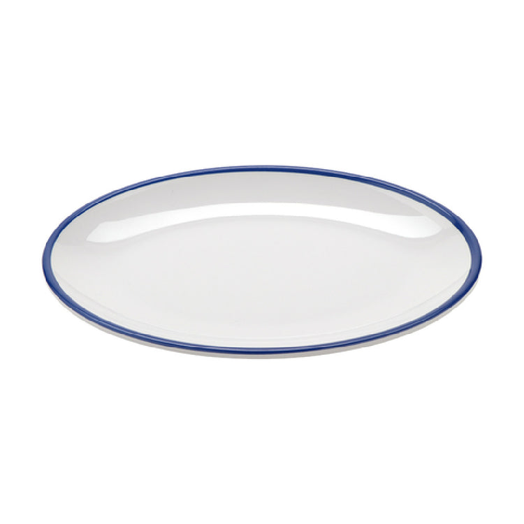 The GET Enterprises OP-960-W/CB Settlement Bistro™ Enamelware Dinner Plate 9" X 6-1/4" Oval is a meticulously crafted piece designed for both aesthetic appeal and practical functionality. Its small oval shape, measuring 9 inches by 6-1/4 inches, makes it an ideal choice for serving a variety of dishes while maintaining a compact footprint. This dinner plate is constructed from durable melamine, a material known for its strength and resistance to breakage, making it suitable for high-traffic environments like restaurants and catering events. The white plate is elegantly accented with a cobalt blue trim, adding a touch of sophistication to any table setting. It is dishwasher safe, ensuring easy maintenance and convenience in fast-paced settings. The plate is NSF certified, which signifies that it meets rigorous public health and safety standards, and is also BPA free, assuring users of its safety for food contact. Packed by two dozen per case, it offers an efficient solution for bulk purchases, catering to the practical needs of food service establishments. This enamelware dinner plate is a versatile addition to any dining collection, seamlessly blending style with functionality.