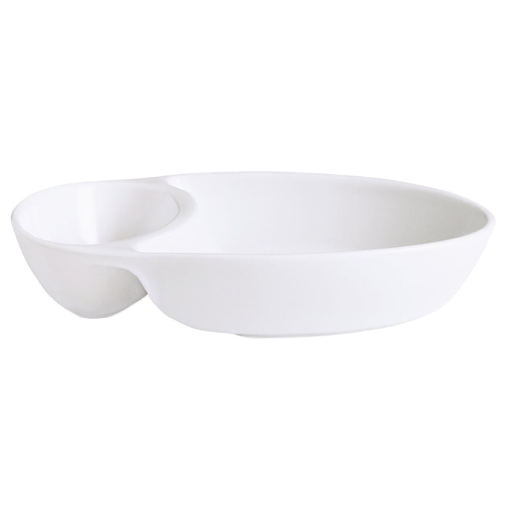 The GET Enterprises PA1101439712 Chip & Dip Dish is a meticulously crafted dining solution designed to enhance your culinary presentation with its dual-compartment structure. With a capacity of 16.9 ounces, this dish measures 9 inches by 5-1/2 inches, offering ample space for serving an assortment of snacks or appetizers alongside their accompanying dips. Its oval shape and bright white porcelain composition lend an air of elegance, making it suitable for both casual and formal dining settings. The dish boasts a rolled edge for added durability, and its scratch and chip-resistant features ensure longevity, even with frequent use. This versatile dish is microwave safe, allowing for convenient reheating of contents, and it can withstand oven temperatures up to 380°F, providing further cooking flexibility. Additionally, it is dishwasher safe, simplifying the cleaning process and maintaining high standards of hygiene in busy environments. Ideal for restaurants, catering services, and home use, the GET Enterprises PA1101439712 Chip & Dip Dish combines functionality with aesthetic appeal, serving as a reliable and attractive choice for any food service operation. This product is stocked in dozens, ensuring ample availability for large-scale use.