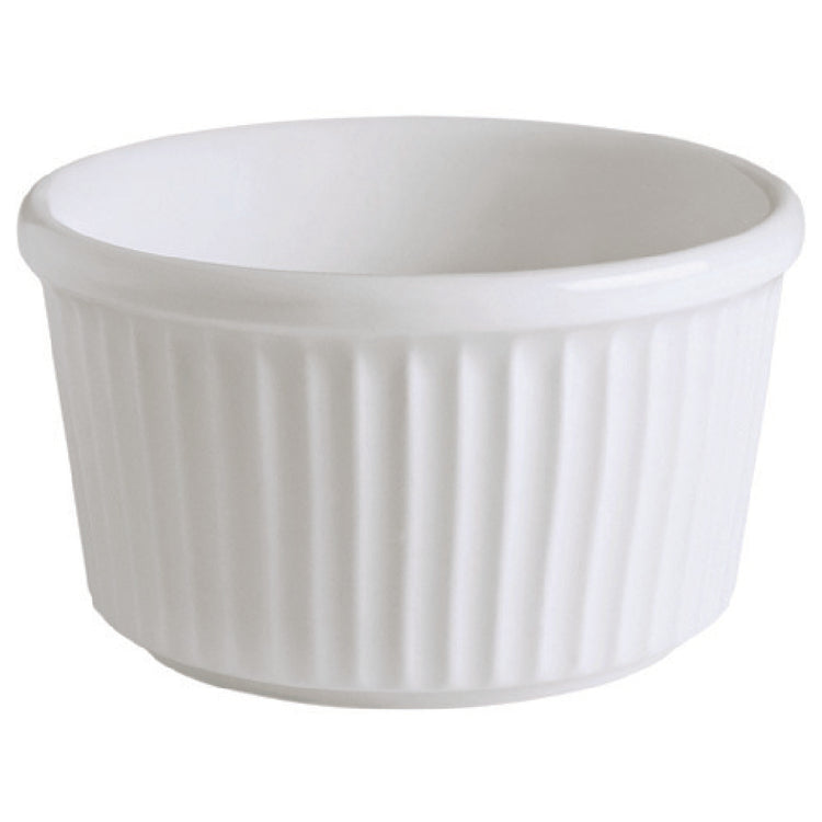 The GET Enterprises PA1101707024 Ramekin - 10.7 Oz. 4-1/3" Dia. is an exceptional piece of serveware designed to meet the rigorous demands of both professional culinary environments and home kitchens. With a substantial capacity of 10.7 ounces and a diameter of 4-1/3 inches, this large, round ramekin is perfect for a variety of applications, from serving sauces and dips to individual desserts. Its ribbed, rolled edge design not only enhances its aesthetic appeal but also increases its durability, making it scratch and chip resistant—ideal for high-traffic use. This ramekin is crafted from high-quality porcelain in a bright white finish, part of the Corona Actualite collection, ensuring it complements any table setting. It is microwave, dishwasher, and oven safe up to 380°F, making it versatile enough to handle different cooking and serving needs. The GET Enterprises PA1101707024 Ramekin is sold as a stocked item, packed by two dozen per case, offering a practical solution for establishments seeking reliable and consistent tableware. Its combination of functionality and durability makes it a preferred choice in various food service segments, from restaurants to catering services, where quality and performance are paramount.